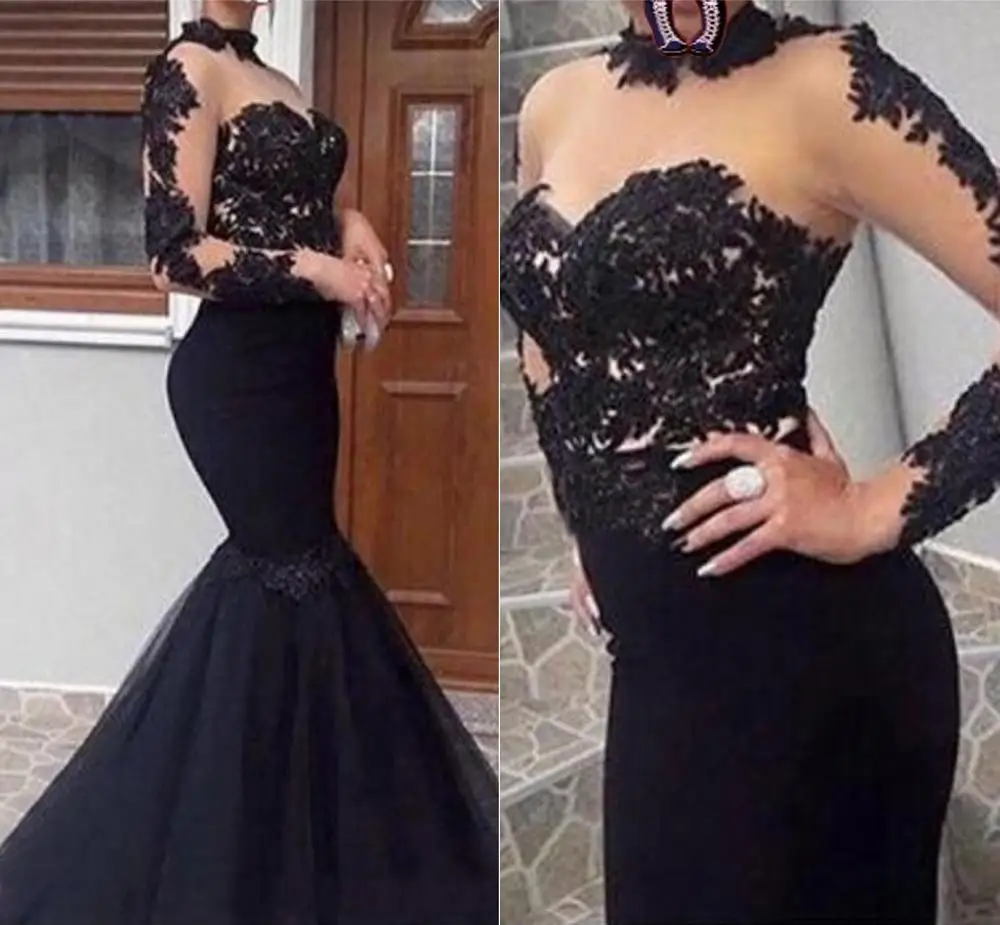 Черные вечерние платья с юбкой-годе, круглым вырезом и аппликацией