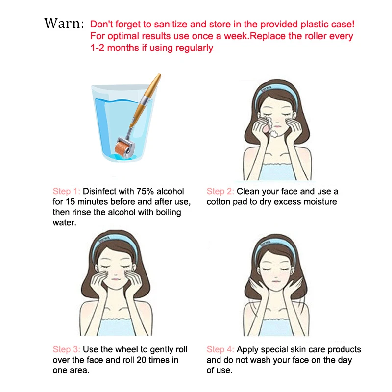 Шаг 1: перед или после использования Замочите ролик микроиглы в 75% спирта в течение не менее 15 минут, а затем в кипящую краскуШаг 2:. Очистите лицо очищающим средством для лица, а затемИспользуйте ватный диск для поглощения избыточной водыШаг 3: равномерно распределите богатый питательный растворНа кожеШаг 4: Используйте ролик, чтобы аккуратно свернутьЛицо 20 раз (с сублимациейПорошок или сыворотка)Шаг 5: нанесите средства по уходу за кожей и не мойте лицо в день использования