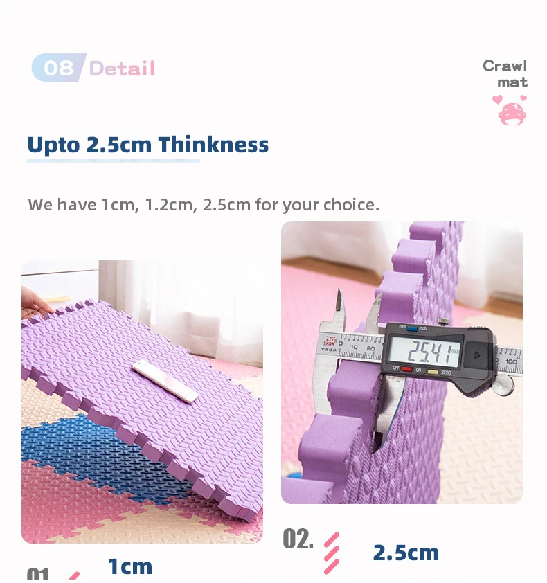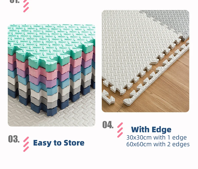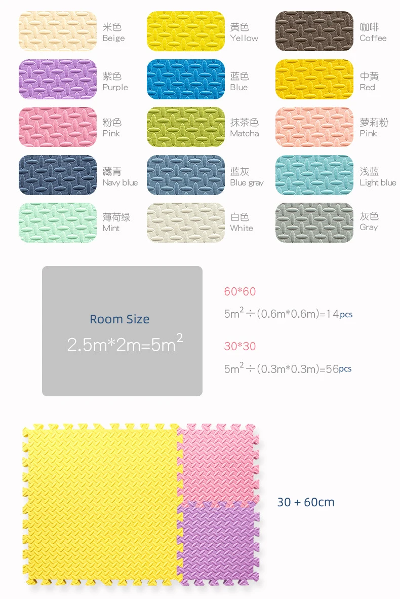Материал: ЭВА/ПЭ Размер: 30x30 см Толщина: 1 см/1,2 см/2,5 см Изготовлен из мягкой пены EVA, безвреден для вашего ребенка. Безопасный, водонепроницаемый, легко чистится. Идеальная игровая площадка для детей, одновременно защищая пол. Никаких мелких деталей, подходит для детей старше 3 месяцев. Выбор разных цветов, вы можете создать свой собственный выбор цветов. Советы: EVA пена, пожаробезопасная, избегайте высокой температуры. Моющиеся, чистые с влажным полотенцем Требуется наблюдение взрослых.