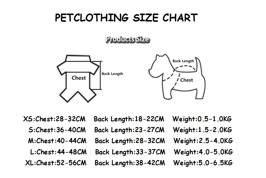 DEЗнакЧертежи Каждый продукт нашей семьи выбирается самим дизайнером, Ткань спроектирована таким образом, чтобы стиль был новым и модным. XS: обхват груди: 28-32 см Длина спины: 18-22СмВес: 0,5-1,0 кг S: обхват груди: 36-40 см Длина спины: 23-27СмВес: 1,5-2,0 кг M: обхват груди: 40-44 см Длина спины: 28-32СмВес: 2,5-4,0 кг L: обхват груди: 44-48См Длина спины: 33-37СмВес: 4,0-5,0 кг XL: обхват груди: 52-56 см Длина спины: 38-42СмВес: 5,0-6,5 кг Пожалуйста, обратите внимание Обхват груди: Измерьте самую широкую окружность груди собаки и удерживайте на 2-3 см больше. Длина спины: измеряет окружность от шеи до хвоста собаки, с 2-3 см защищены. Длина шеи: Измерьте длину шеи собаки за одну неделю и удерживайте на 2-3 см больше. Напоминание Из-за разницы дисплея и влияния на светильникНебольшие различия между картинкой и реальным предметом, и фактический объект будет превалировать!При ручном измерении возможны незначительные погрешности. Таблица размеров только для справки! Физическая фотография