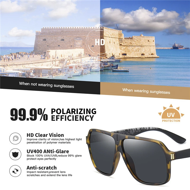 100% защитное покрытие UV400, Блокирует 100% вредных UVA & UVB лучей. Поляризованные солнцезащитные очки уменьшают блики, отражающиеся от дорог, водоемов, снега и других горизонтальных поверхностей, восстанавливают истинный цвет, сокращают отраженсветильник и очисветильник и отлично защищают глаза.