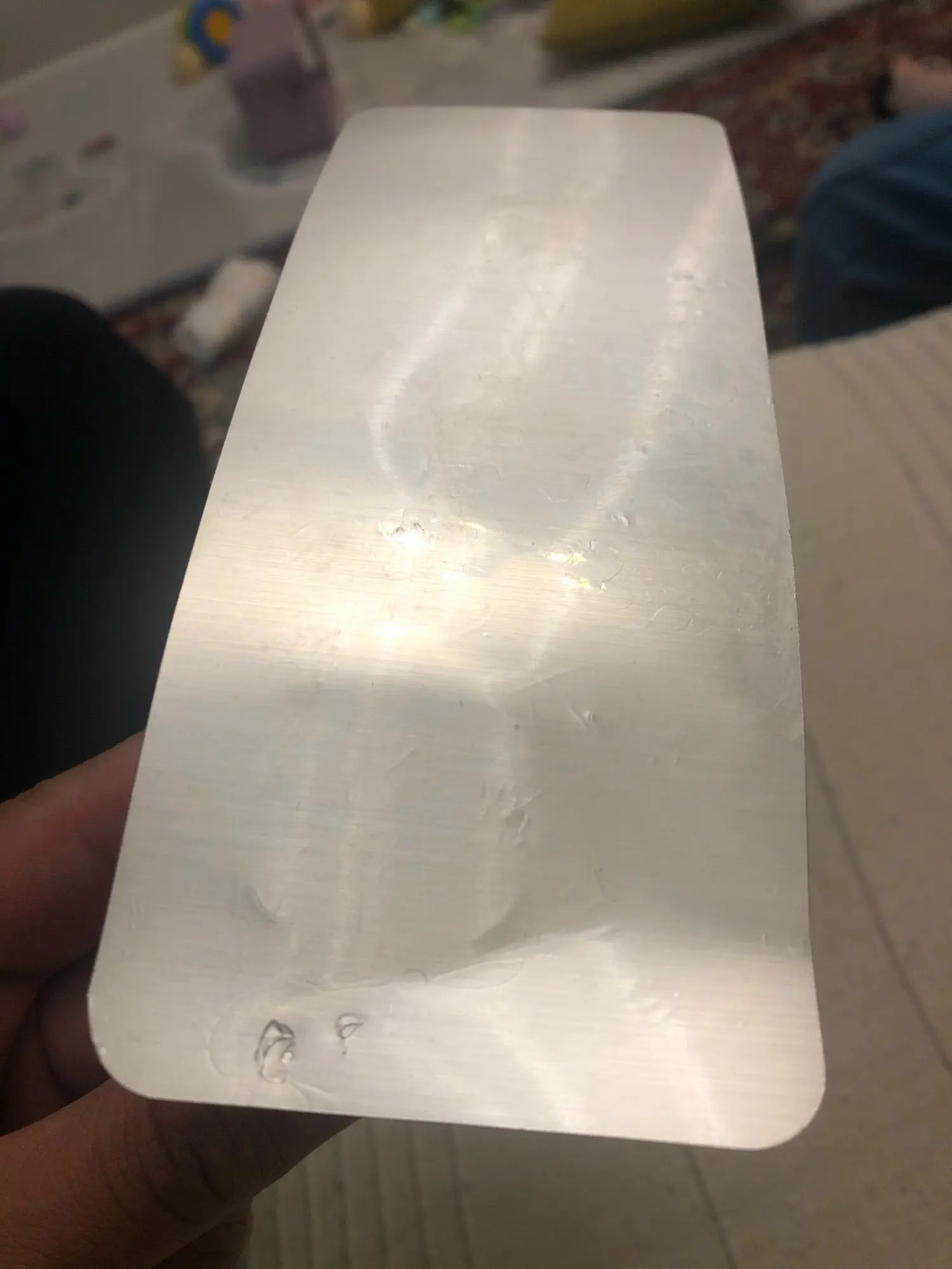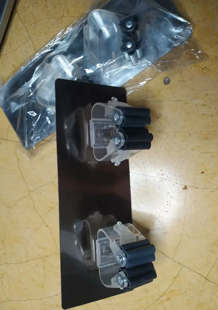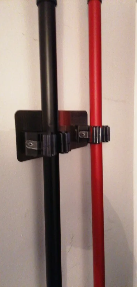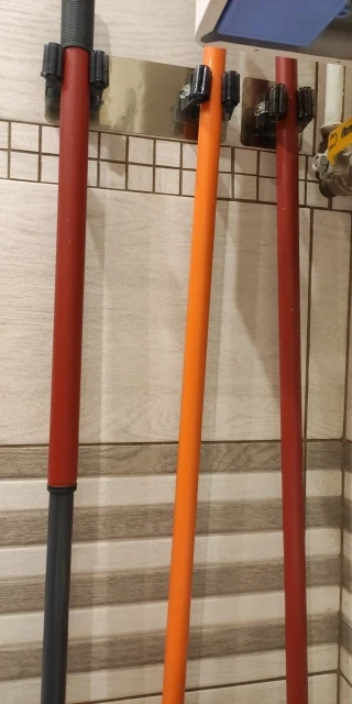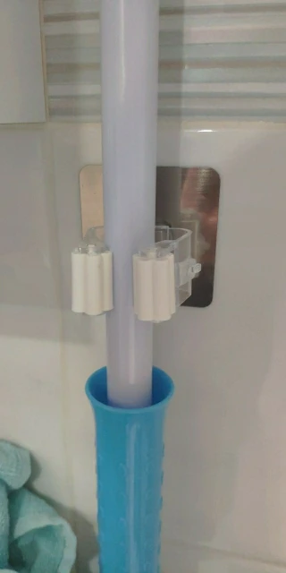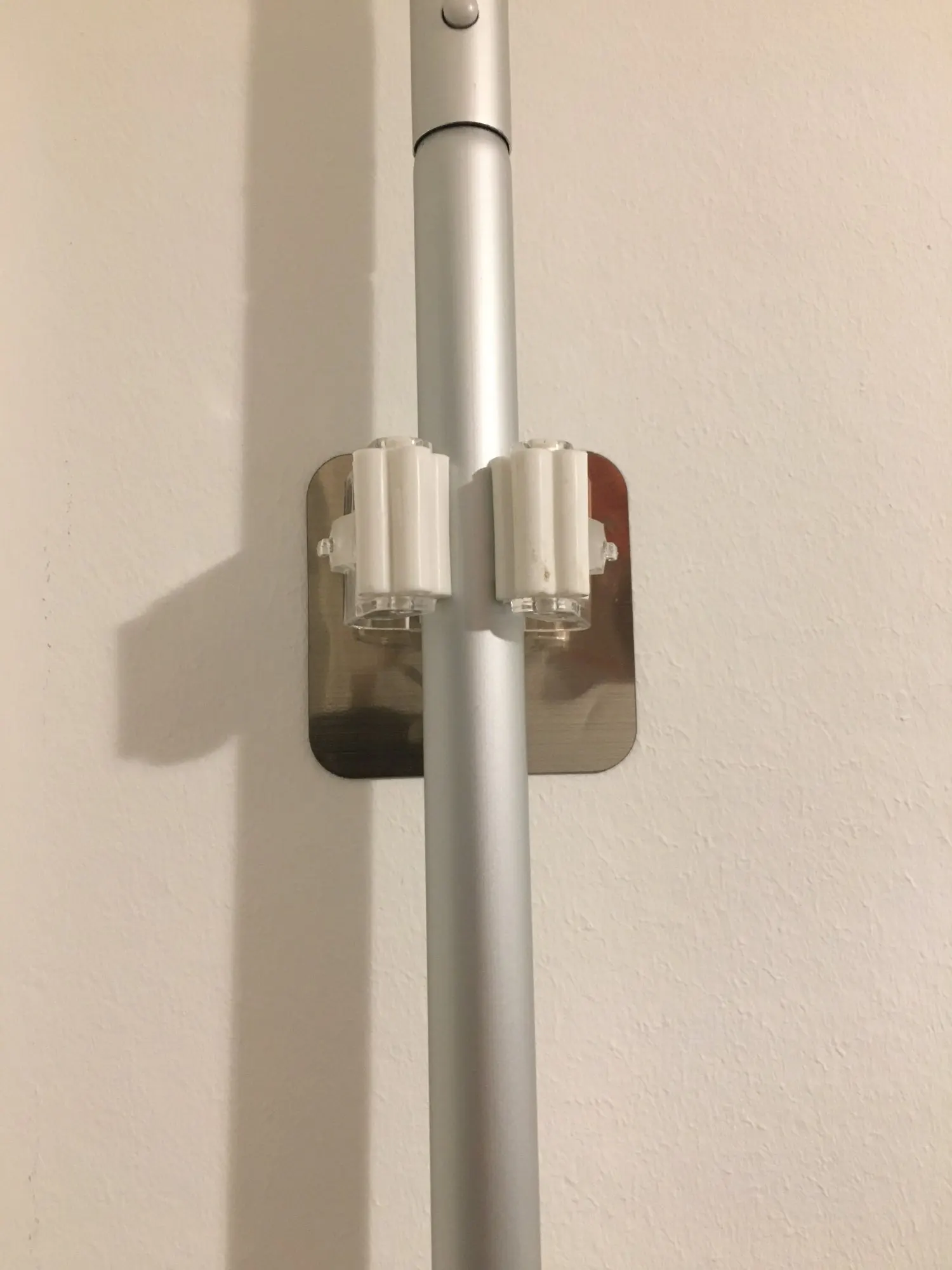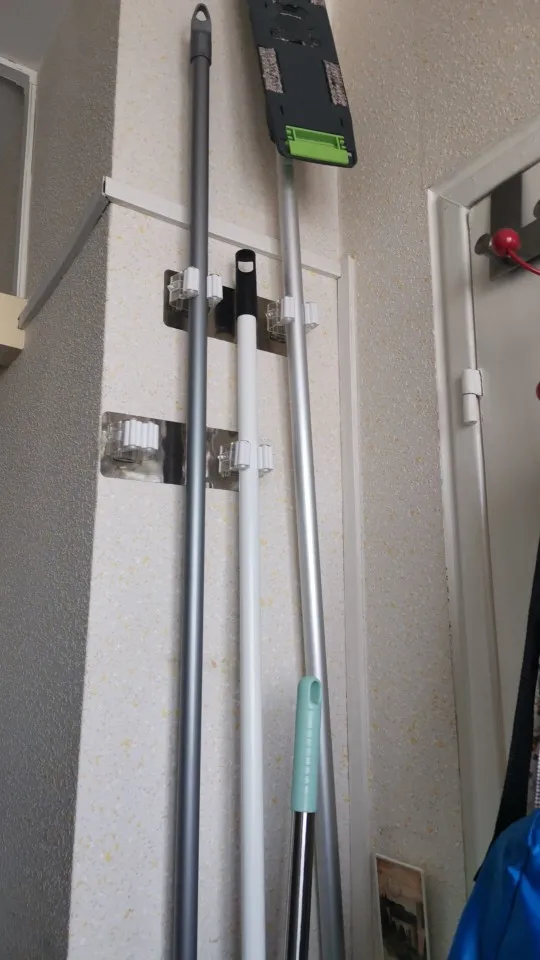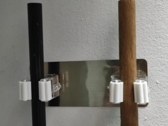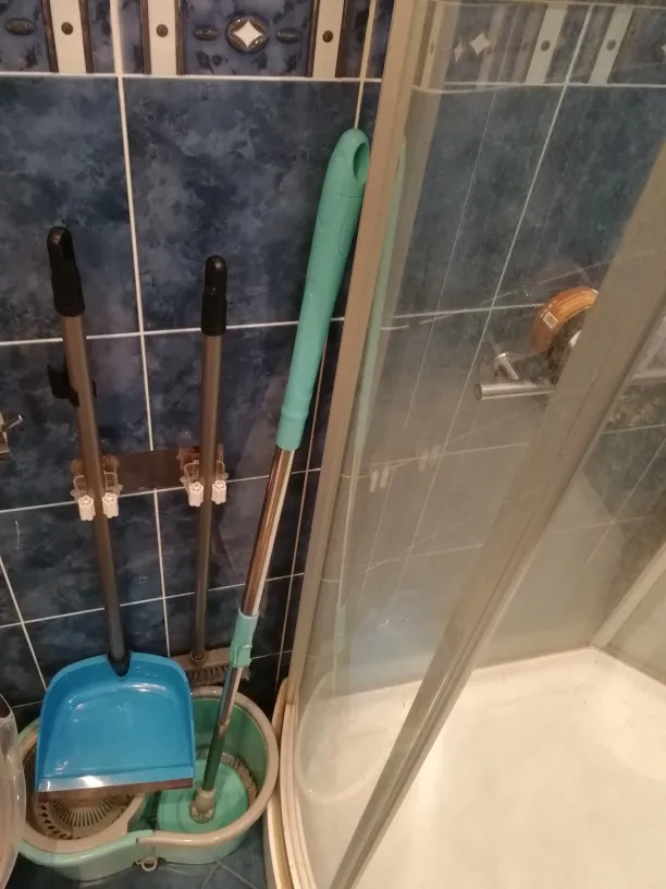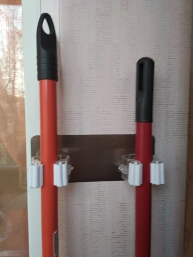 Крепеж пришел свернутым в три погибели, поэтому блестящее основание сильно замялось. Разгладить невозможно, вмятина хорошо видна даже издалека. Приклеилось нормально. Обратите внимание, что толстые швабры не помещаются (у меня самоотжимающаяся). Внутри каждого крепежа за створками натянута плотная резинка. Она позволяет удерживать эти створки сомкнутыми, но сама не пускает дальше толстые палки.