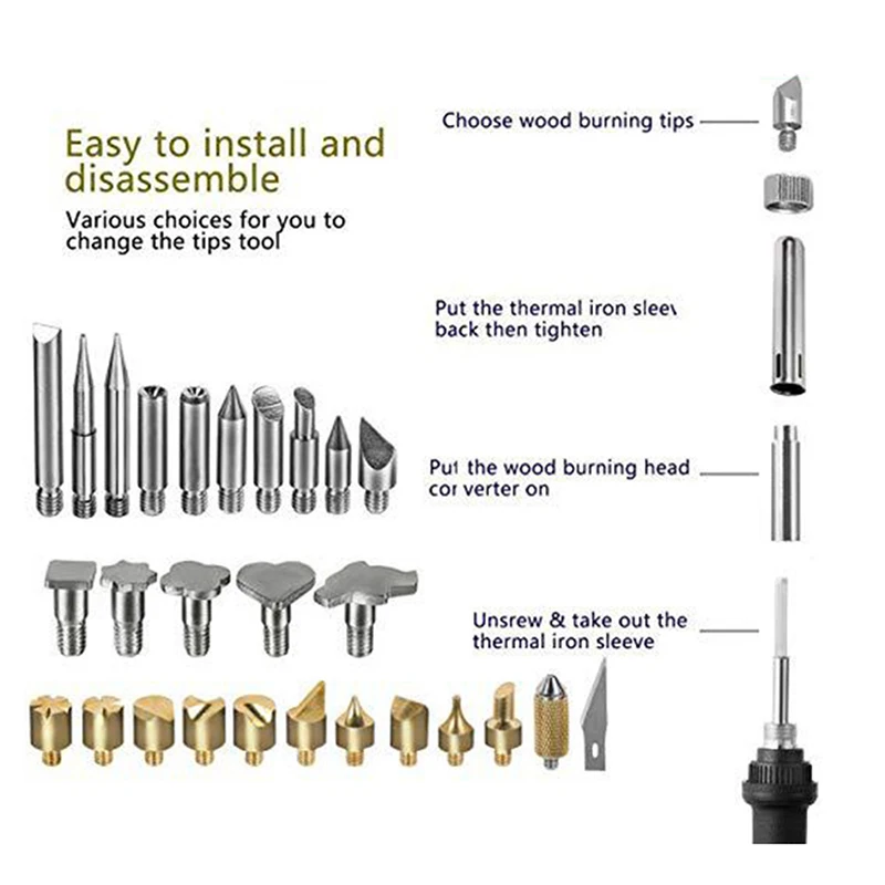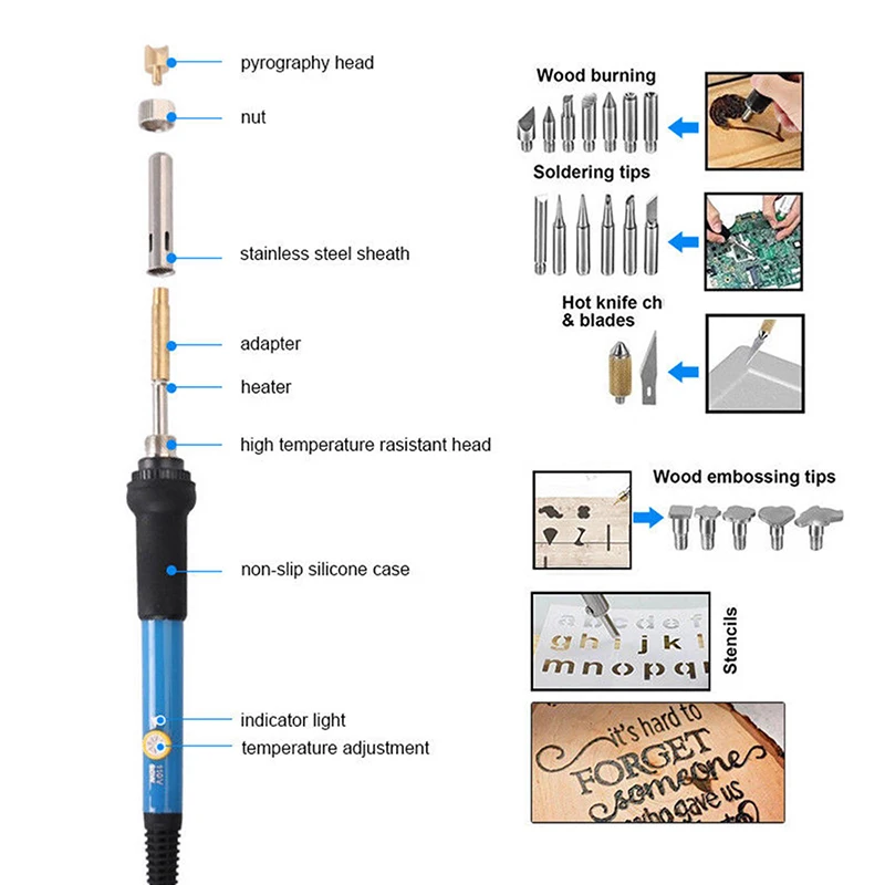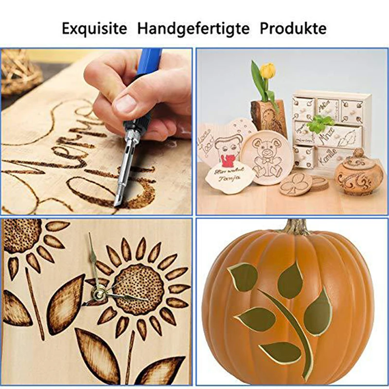 Полезный паяльник, очень прост в эксплуатации. Очень подходит для ваших потребностей в сварке-деревянная сварка, обработка древесины, хобби, ремесла, домашнее украшение. Подходит для сжигания дерева, импринта, резьбы, резьбы, тиснения, надписи и украшения на дереве, меху, персиковой кости, пробке и коже. Идеальный инструмент для изготовления подарочных деревянных рам и деревянных изделий на заказ