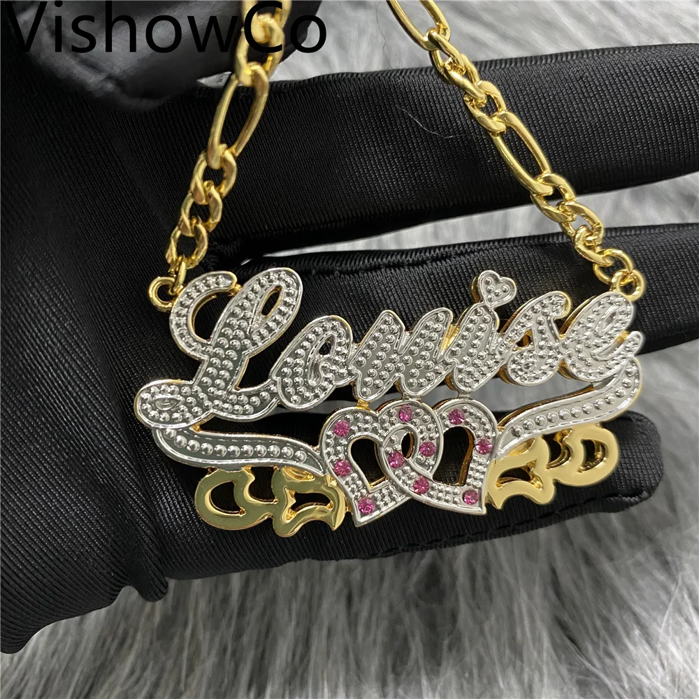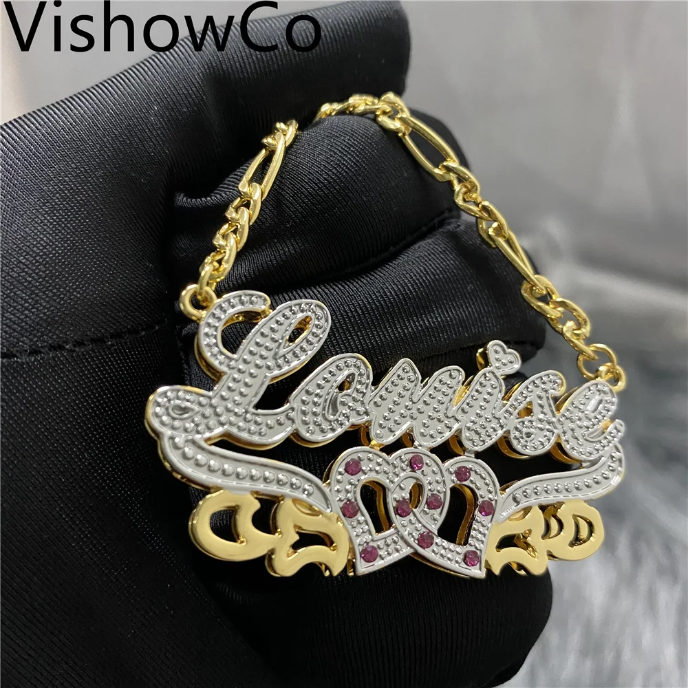 Индивидуальное ожерелье с именем VishowCo, двойное позолоченное ожерелье с именной табличкой на заказ, ожерелье с 3D цирконием на заказ, s Hip Pop ювелирные изделия