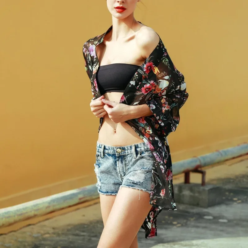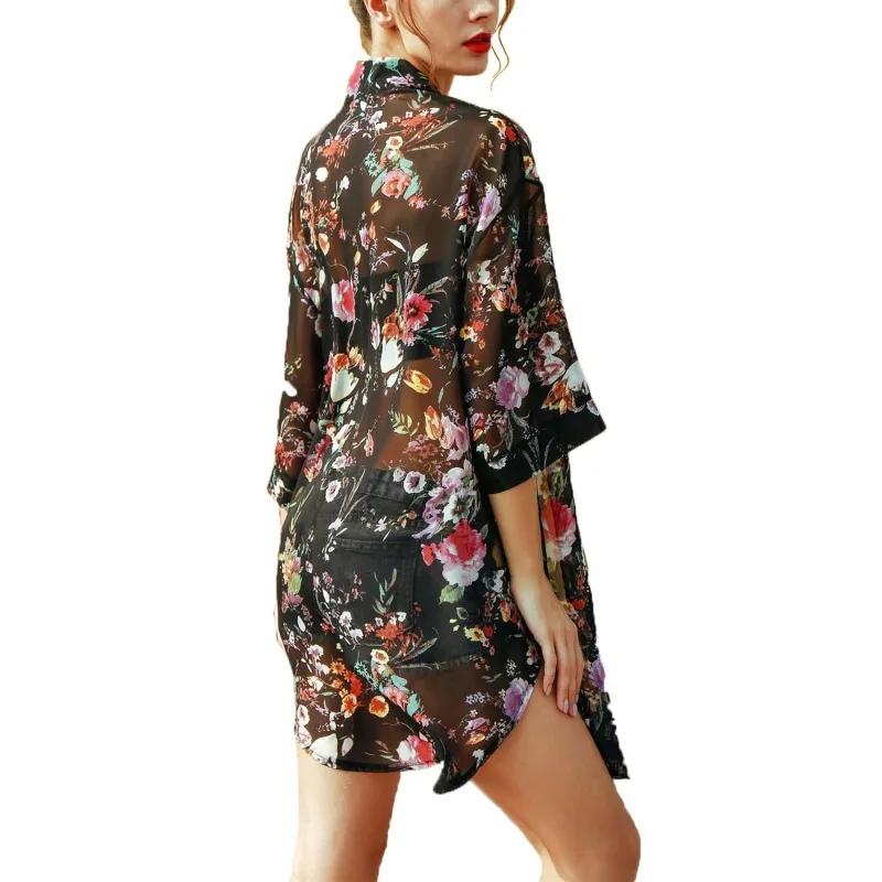 Женская винтажная Цветочные шифоновые блузки свободная шаль кимоно кардиган бохо Топы Длинные солнцезащитные куртки блузка