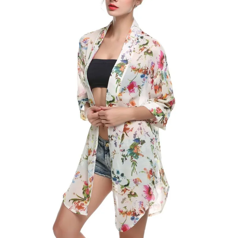 Женский винтажный Свободный кардиган-кимоно в стиле бохо, Длинный солнцезащитный жакет, блузка, цветочные шифоновые блузки