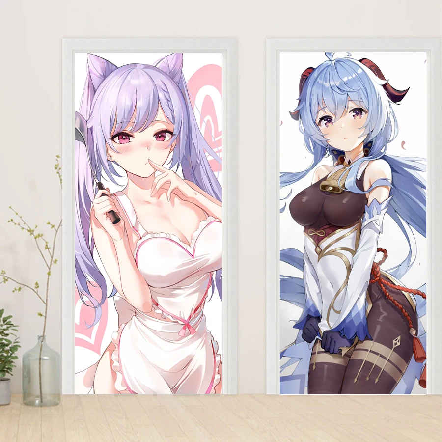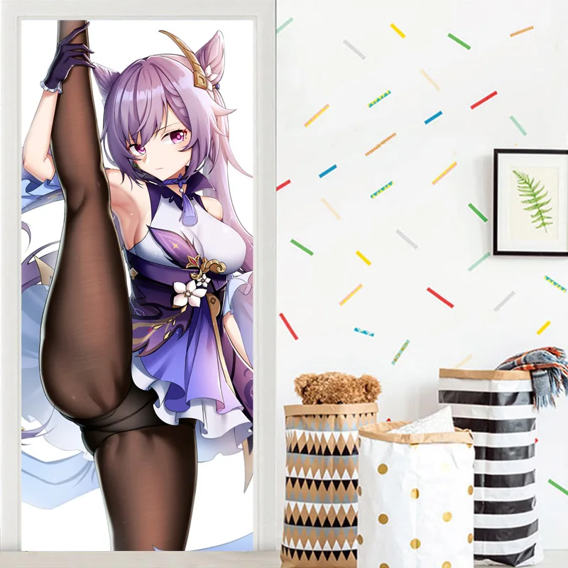 ПВХ наклейка на дверь игра Genshin ударопрочные обои Гостиная Keqing дверь плакат самоклеящиеся сексуальные аниме девушки роспись стекло наклейка