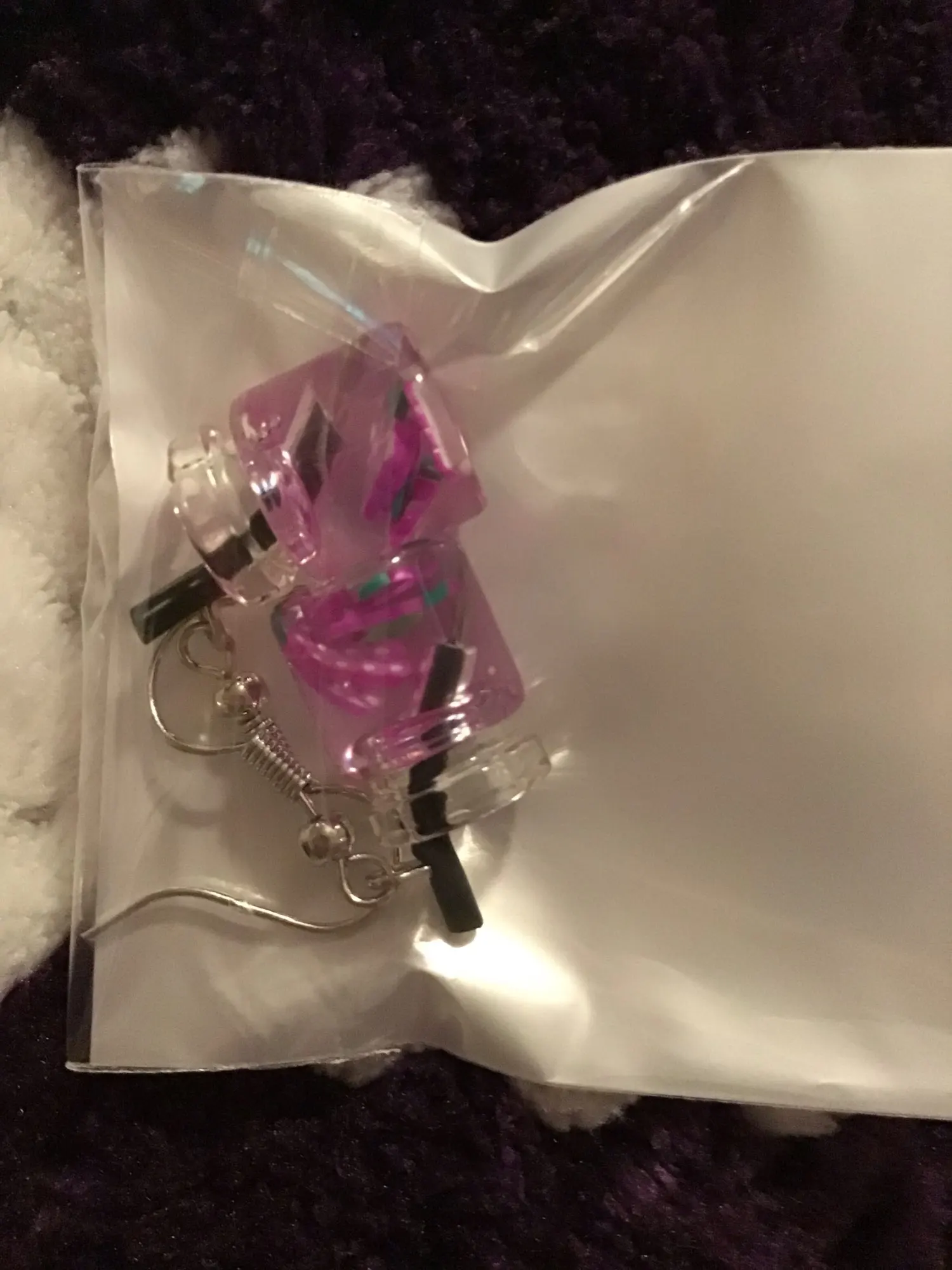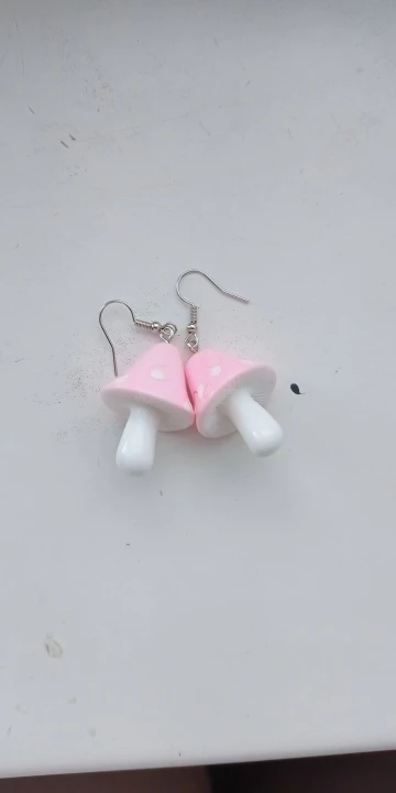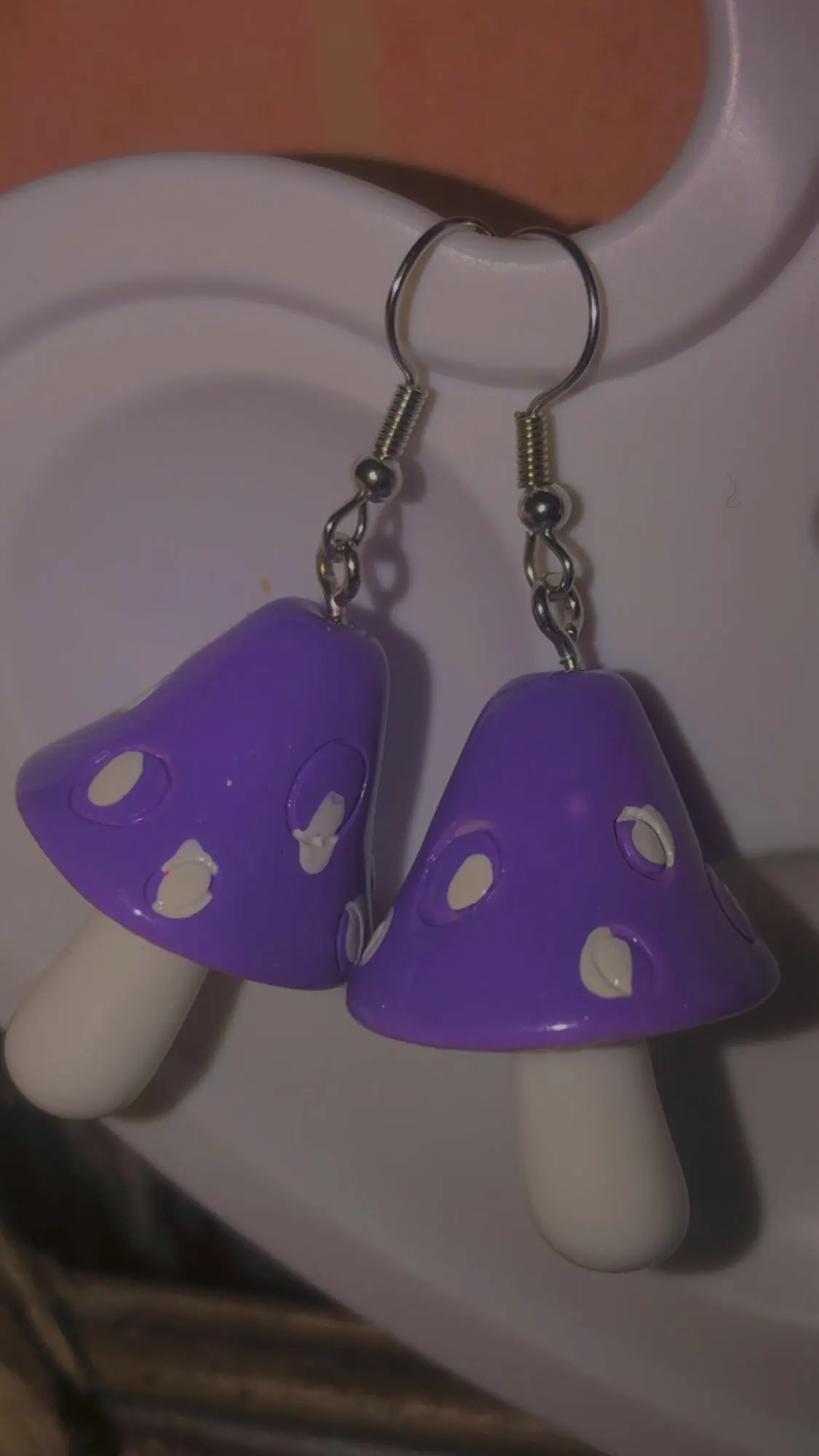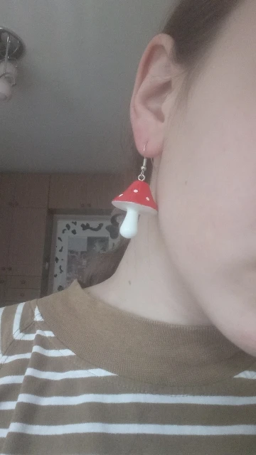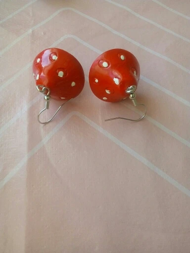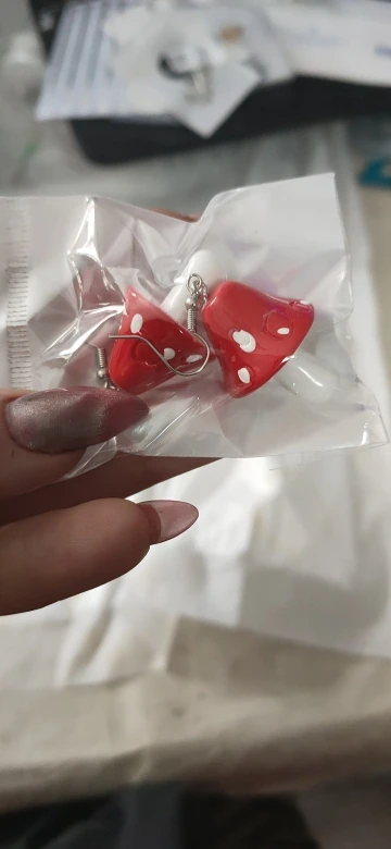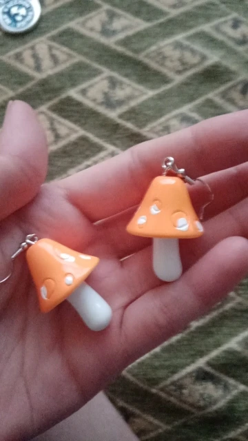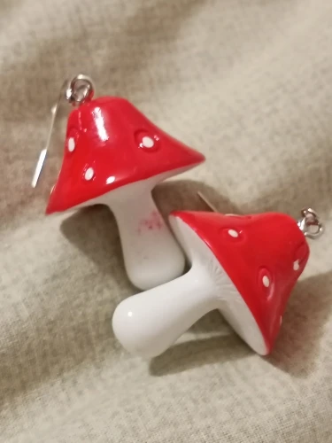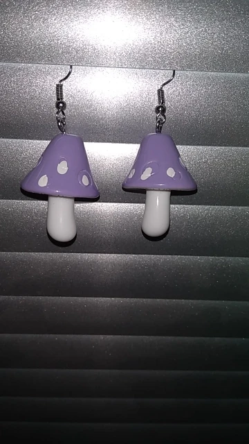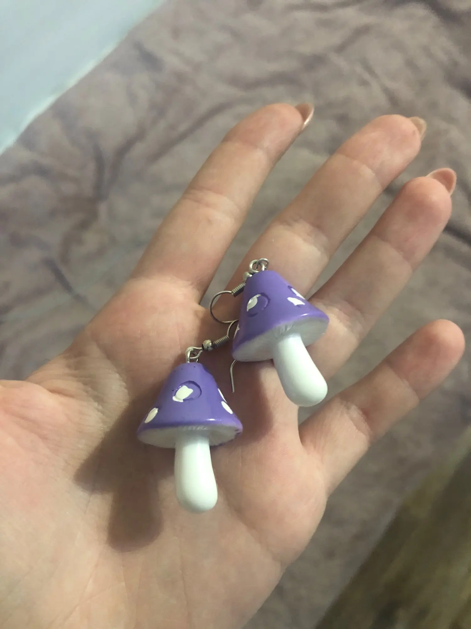 мне очень нравятся эти серëжки, миленькие. но на фотографии у продавца они ярче, чем в жизни(так они более пепельно-фиолетовые). точки нарисованы максимально неровно, что немножко отталкивает. в целом не плохо, носить можно.