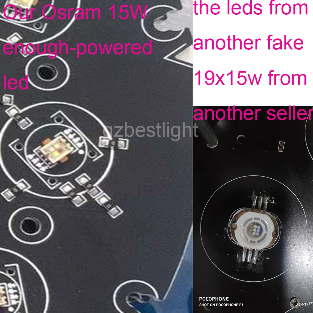 Это светодиодные фотографии, отправленные от другого клиента, он купил 19x15w у других, и он сломан, И он вернулся к нам и попросил нас сделать для него послепродажное обслуживание. Это действительно так.