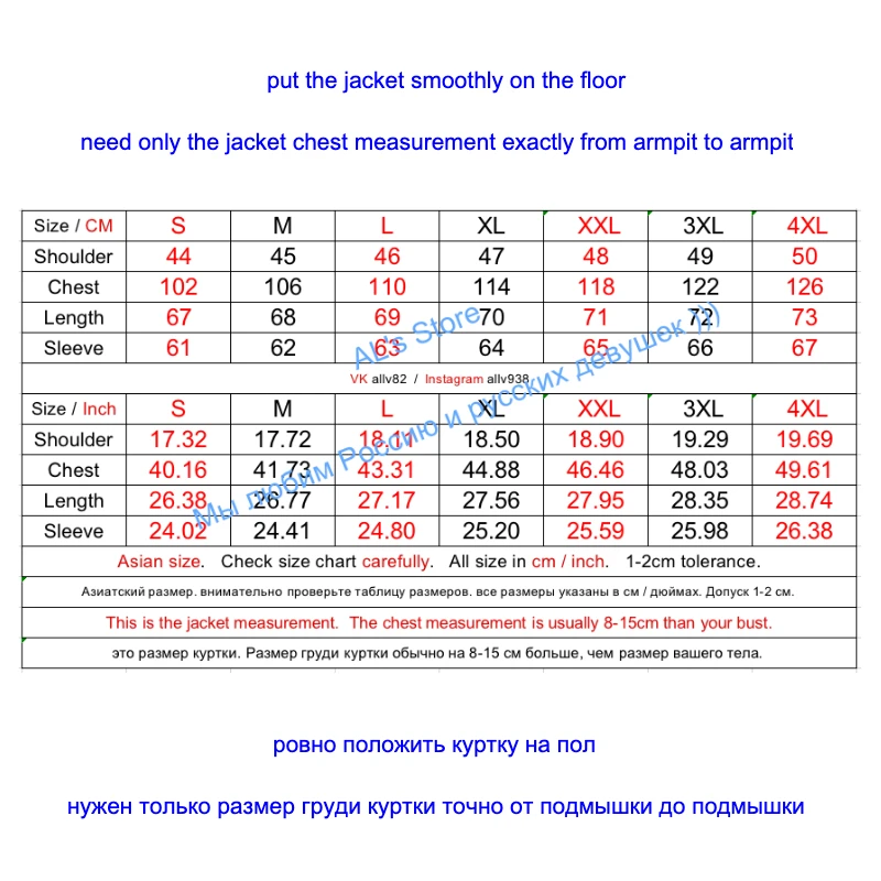 Пожалуйста, проверьте таблицу размеров и измерьте вашу куртку, как показано ниже.