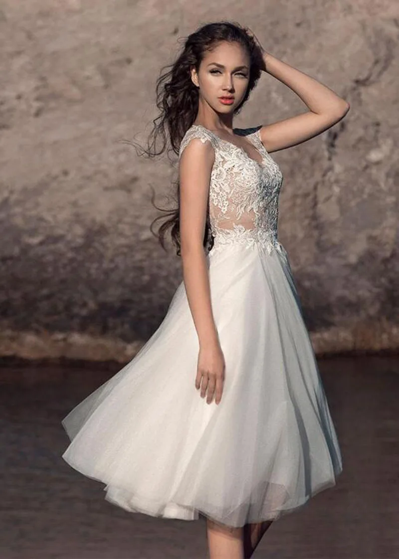 Женское Короткое свадебное платье, белое кружевное платье-трапеция ...
