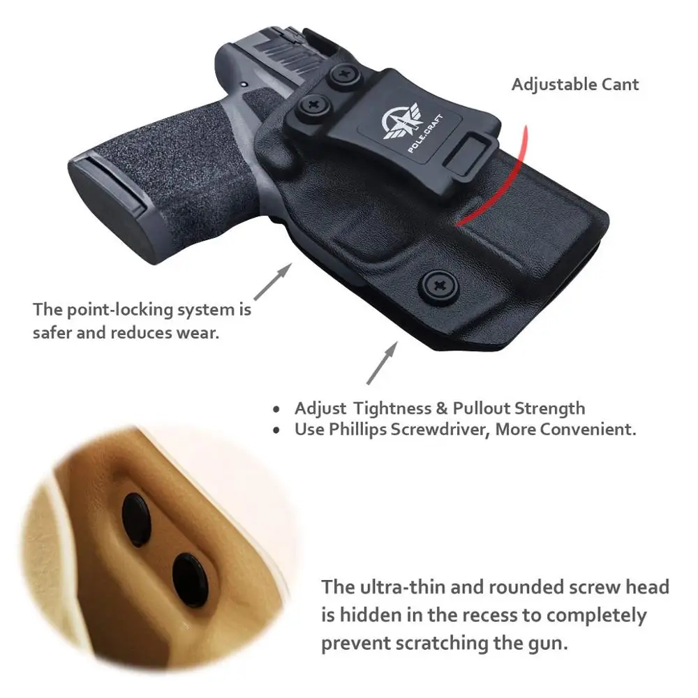 Наши Springfield Armory Hellcat кобура IWB имеет Posi-клик слышен удержания замочный механизм, а пистолет имеет четкие «нажмите» звук, когда она вставляется, таким образом, вы знаете, что ваш пистолет плотно сидит. Поскольку время реакции имеет критическое значение для выживания, мы используем установочный винт для регулировки герметичности для определения силы, необходимой для извлечения. Нейлон + ремень из стекловолокна крепкие и надежные зажимы, вы можете отрегулировать угол от 0 до 15 градусов в соответствии с вашими привычками, чтобы вы могли достичь самой быстрой скорости.