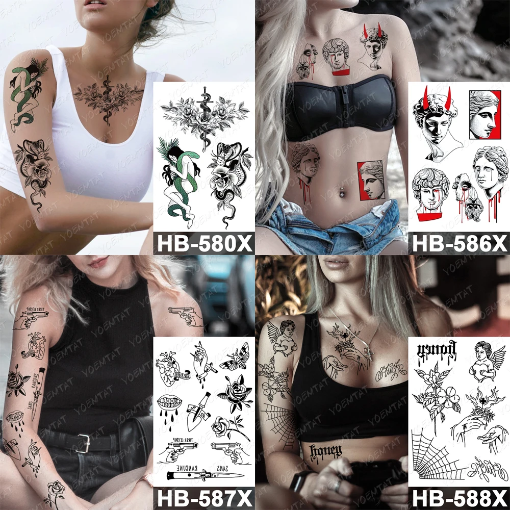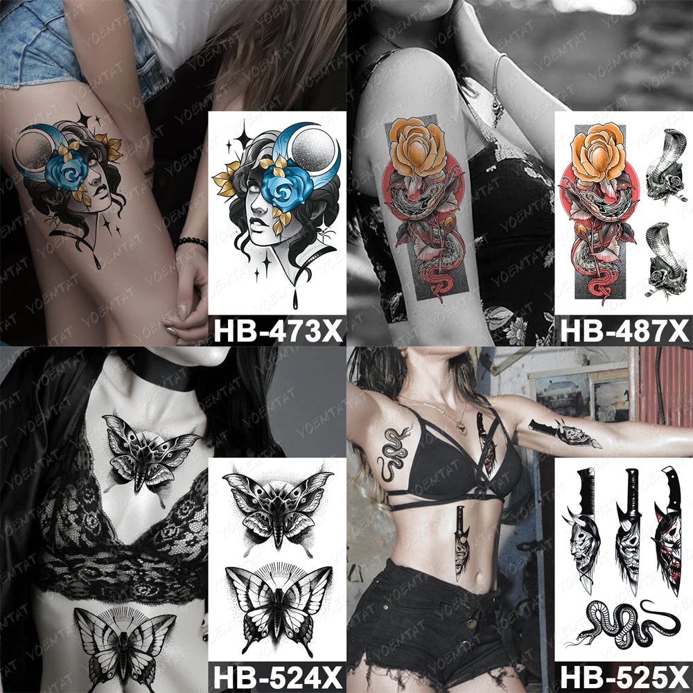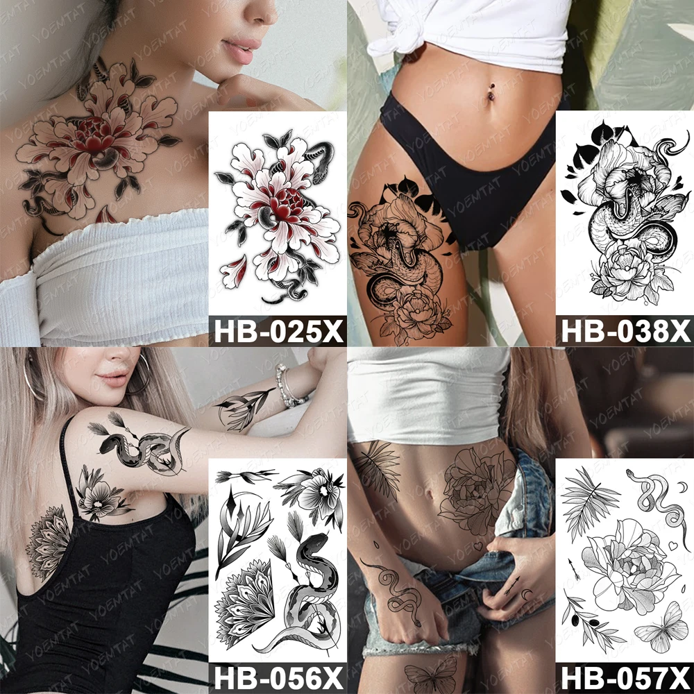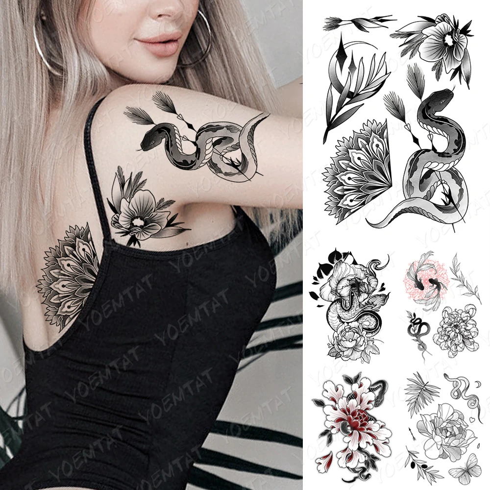 Водостойкая временная татуировка-наклейка, темная Старая школа, татуировка со змеей и листьями, черные лотосы, боди-арт на руку, искусственная татуировка для женщин и мужчин