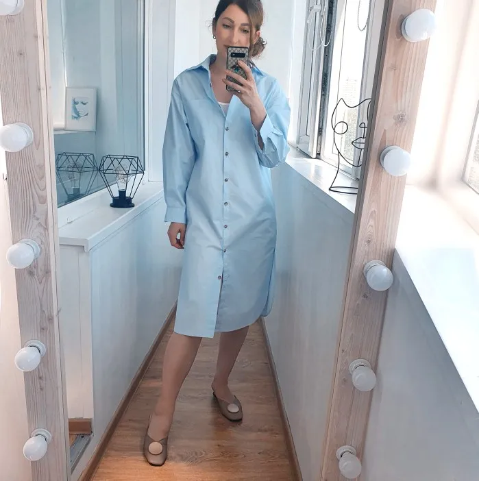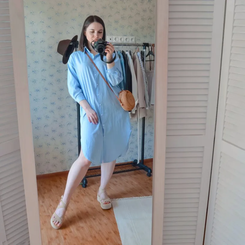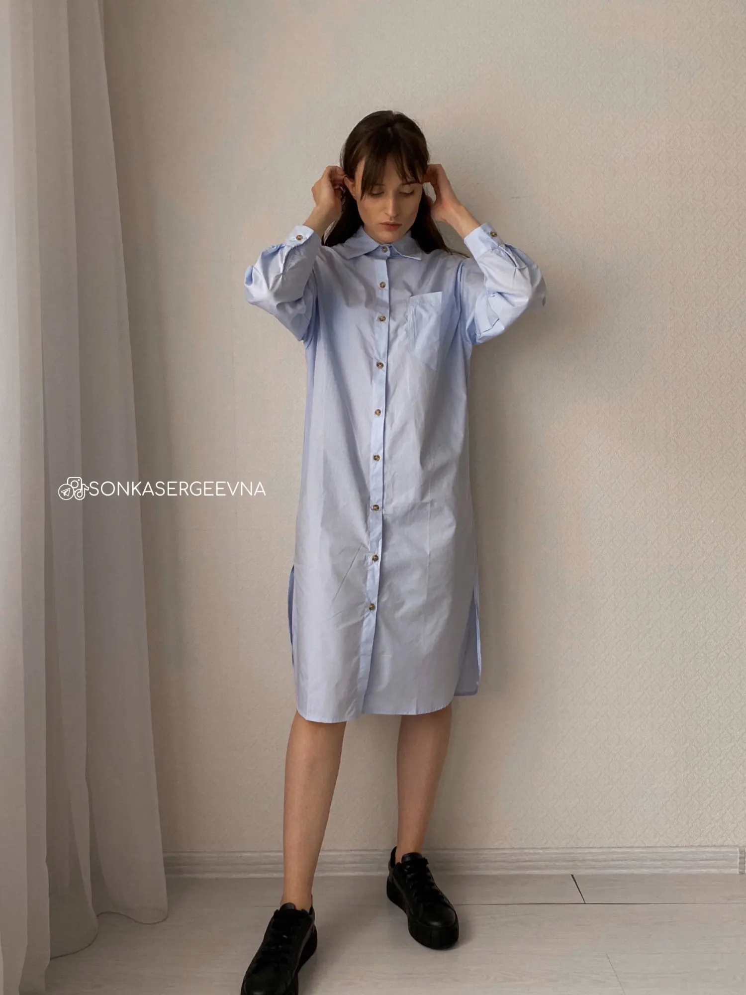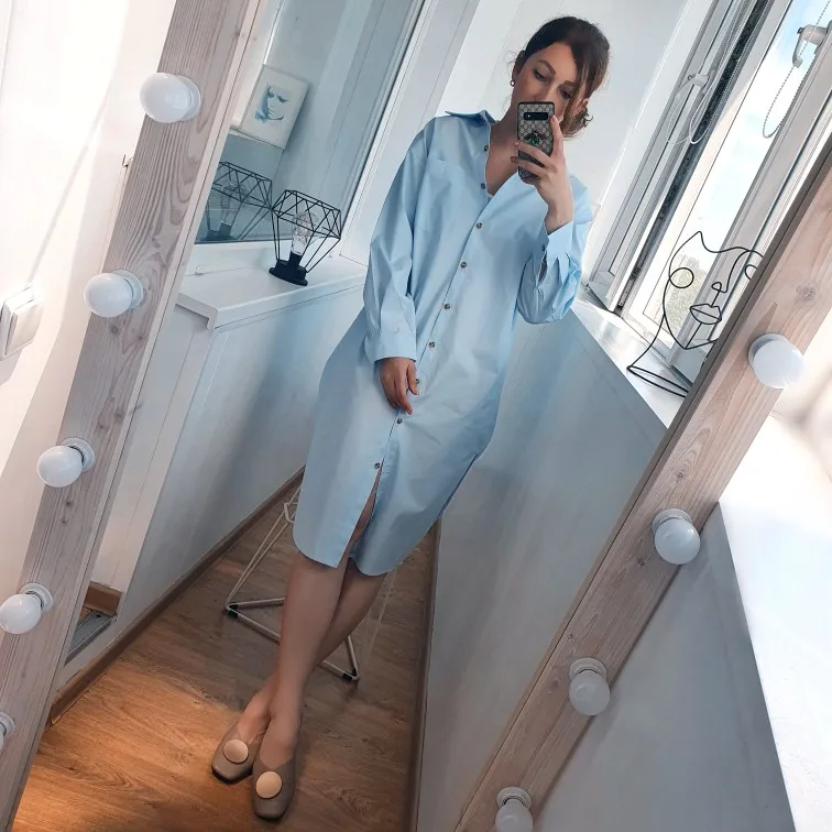 Длинное платье-рубашка. Цвет очень красивый. Качество хорошее. Застегивается на пуговицы. Сбоку на груди есть один карман. мой инст: sveta_vi_ телега: lightandfashion Материал средней плотности, приятный к телу и не просвечивается. В составе хлопок. Платье свободного кроя, плечи спущенные, рукава длинные. Единый размер подошел отлично, но сейчас появился выбор размеров от S до XL. Мои параметры: 83-63-90 см, рост 164 см. Платье можно носить как самостоятельно, так и вторым слоем с топами и футболками.