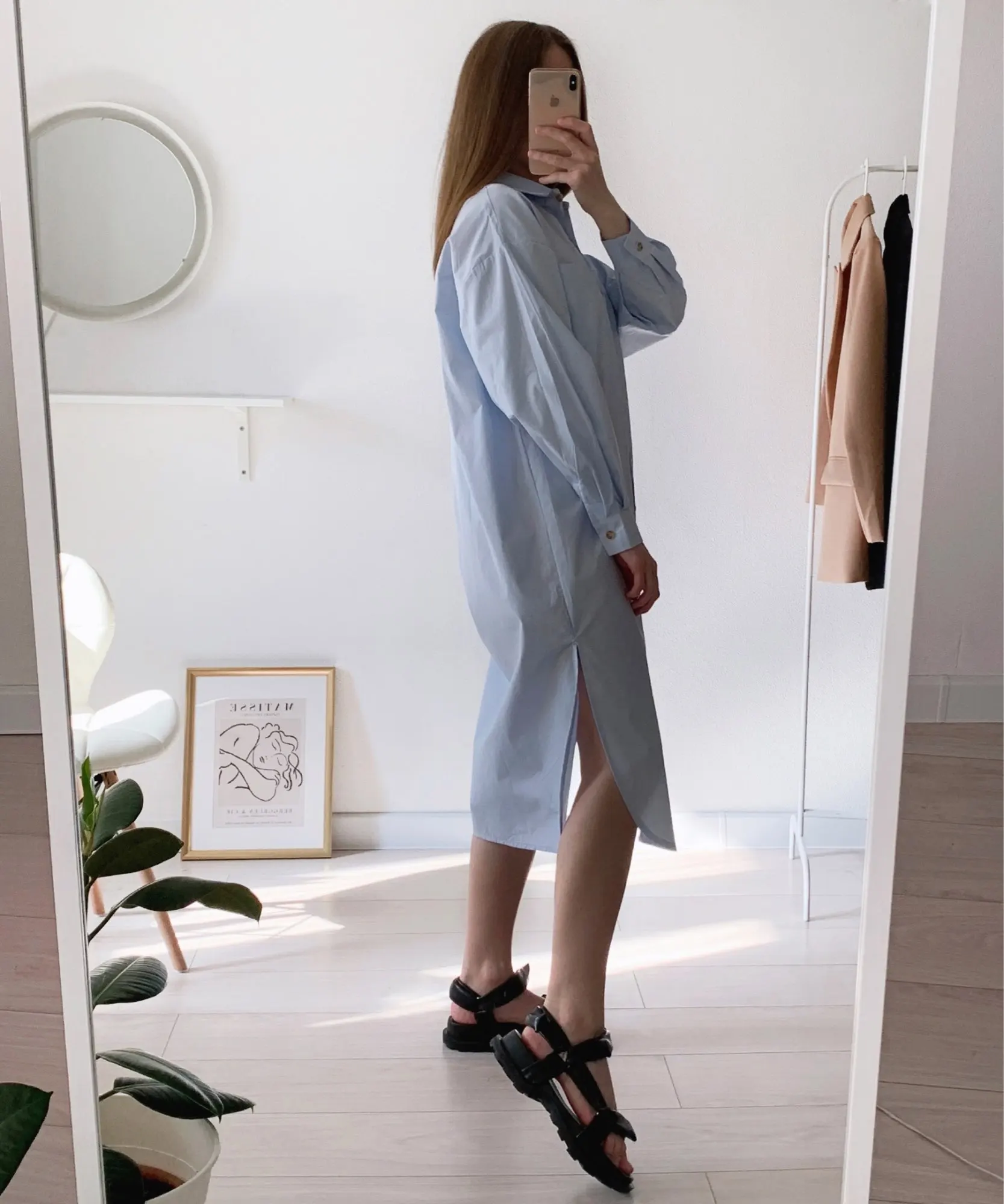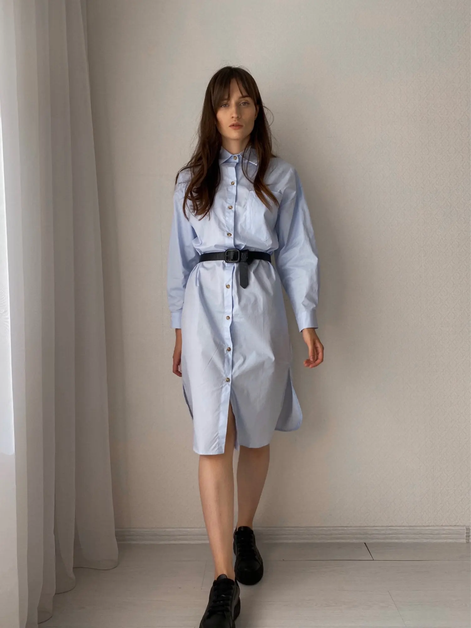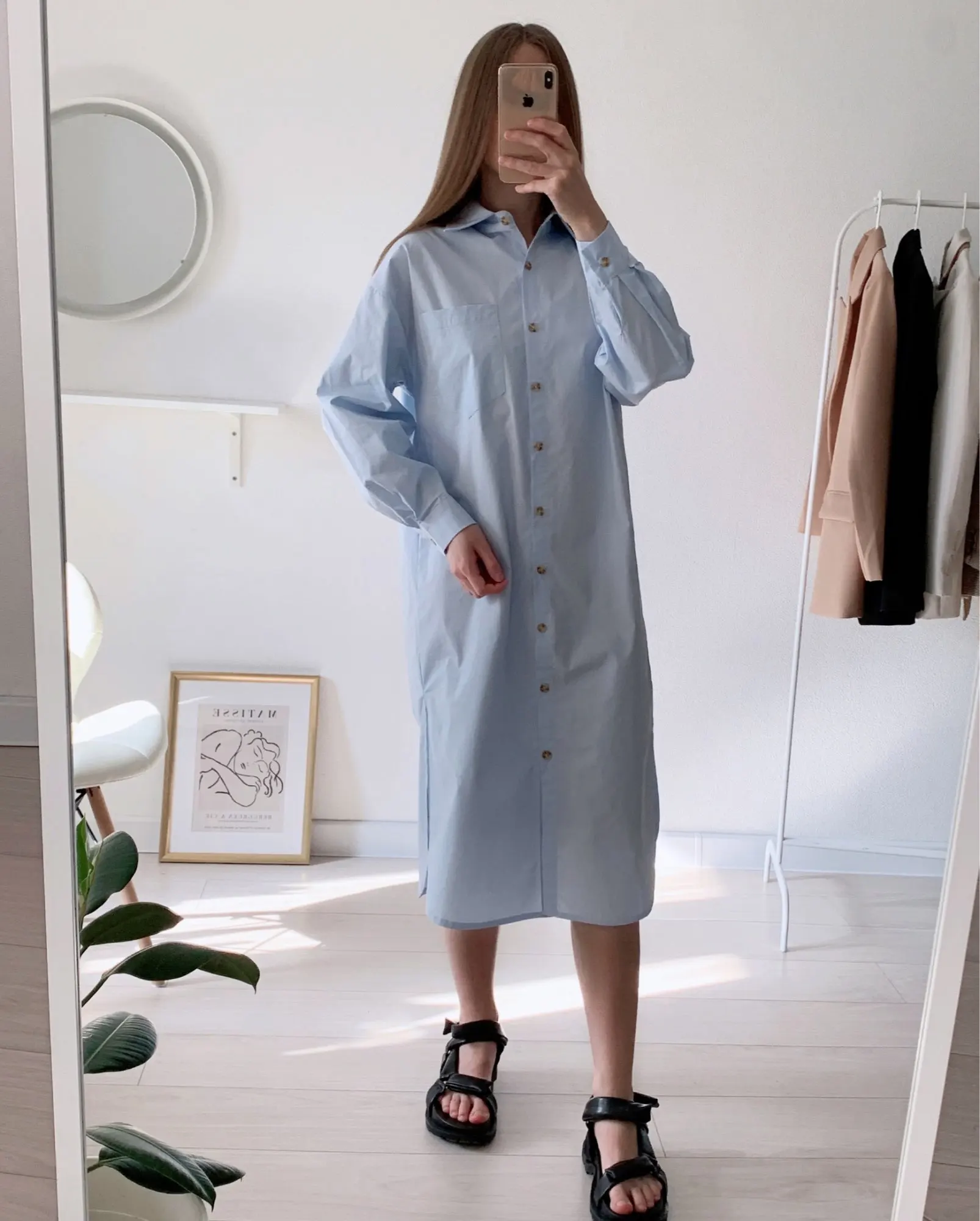 Длинное платье-рубашка. Цвет очень красивый. Качество хорошее. Застегивается на пуговицы. Сбоку на груди есть один карман. мой инст: sveta_vi_ телега: lightandfashion Материал средней плотности, приятный к телу и не просвечивается. В составе хлопок. Платье свободного кроя, плечи спущенные, рукава длинные. Единый размер подошел отлично, но сейчас появился выбор размеров от S до XL. Мои параметры: 83-63-90 см, рост 164 см. Платье можно носить как самостоятельно, так и вторым слоем с топами и футболками.