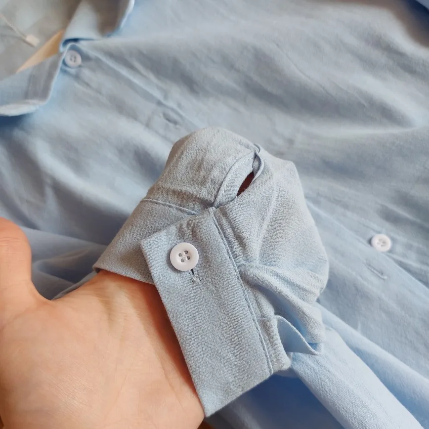 Платье-рубашка Для себя выбрала цвет Blue в размере М. Хорошо село на параметры: Рост 175см Объём груди 86см Объём талии 65см Объём бёдер 94см Есть небольшой запас. Платье аккуратно сшито. Пуговки коричневого цвета, по бокам разрезы, на спине защип, который создаёт дополнительный объём. Состав не указан, скорее всего это хлопок. Платье тяжело отпаривается. Рукав на мой рост хорошей длины. При распаковке постороннего запаха не было.