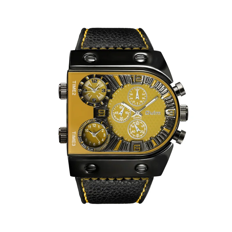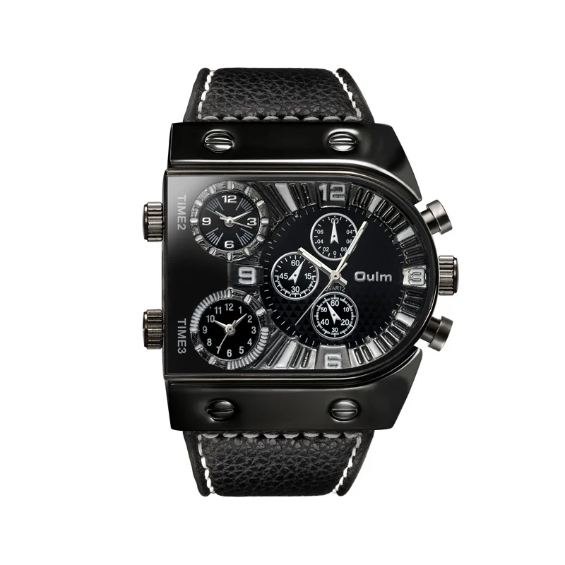 Часы Oulm Мужские наручные кварцевые в стиле милитари, повседневные спортивные с кожаным ремешком, с разными часовыми поясами