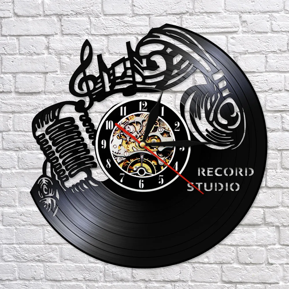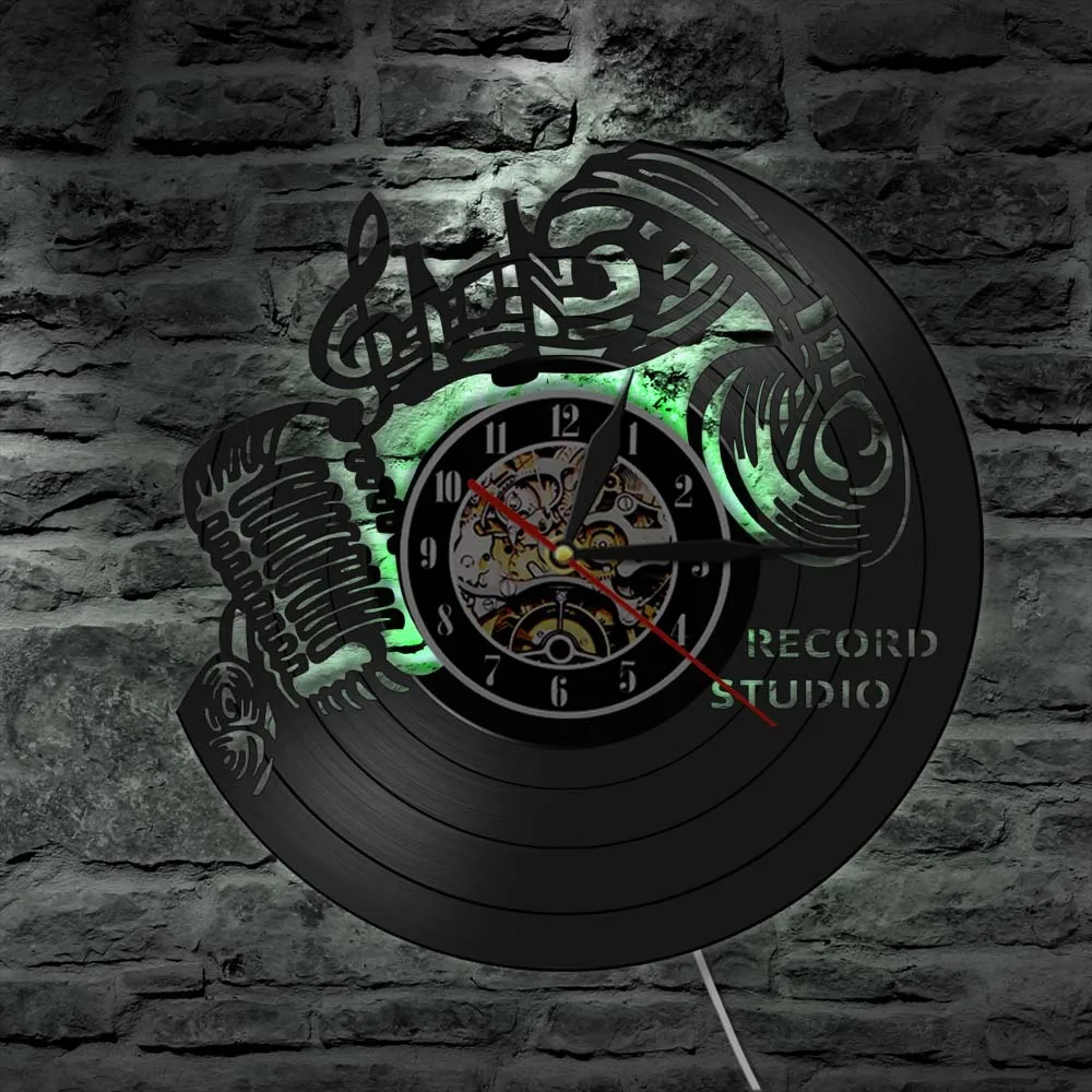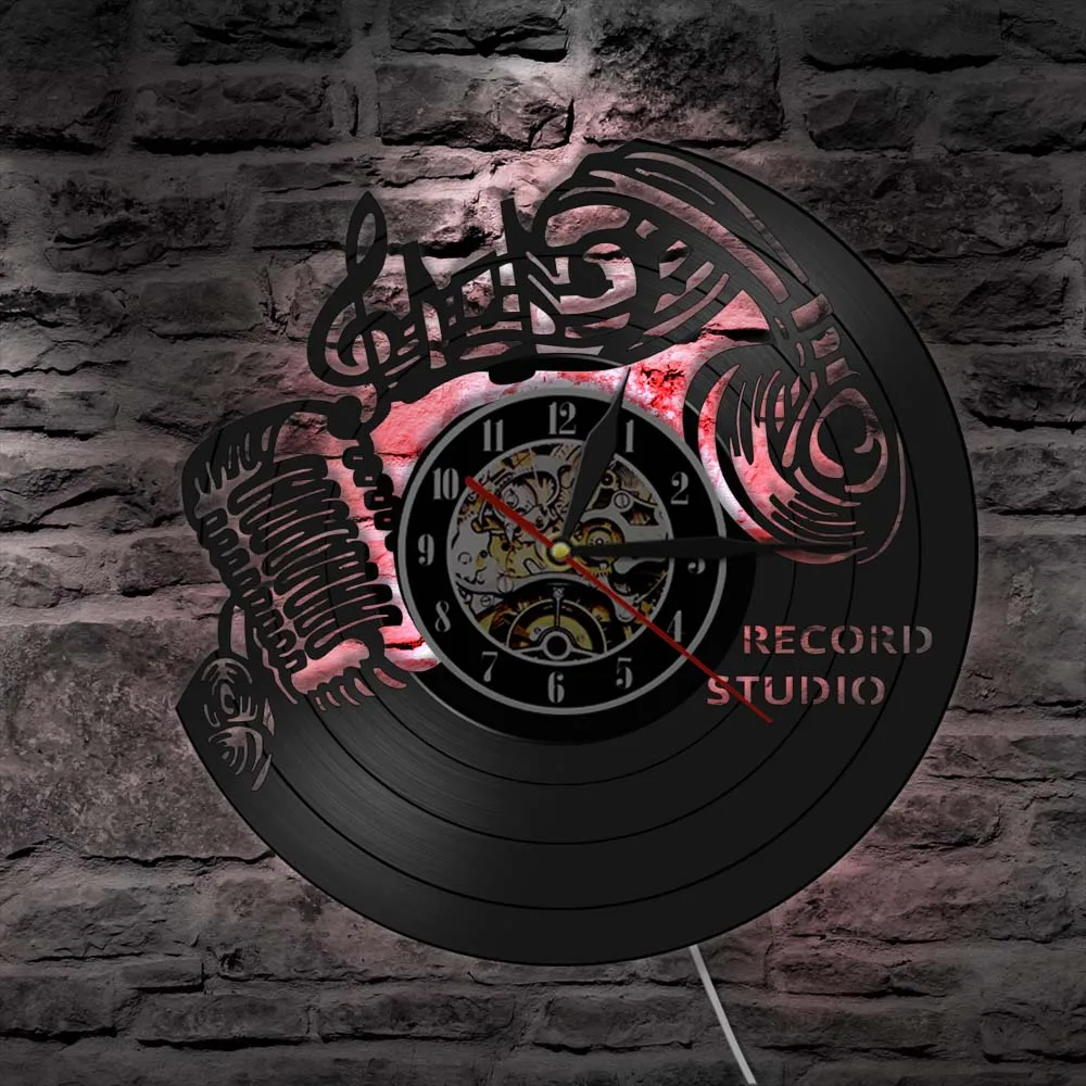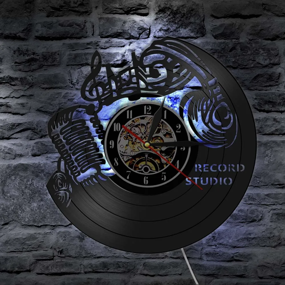 Настенные часы с музыкальными заметками, виниловые настенные Арт-часы с скрипичным ключом, винтажные часы с микрофоном, гарнитура в стиле рок-н-ролл, настенный светильник