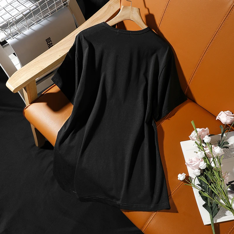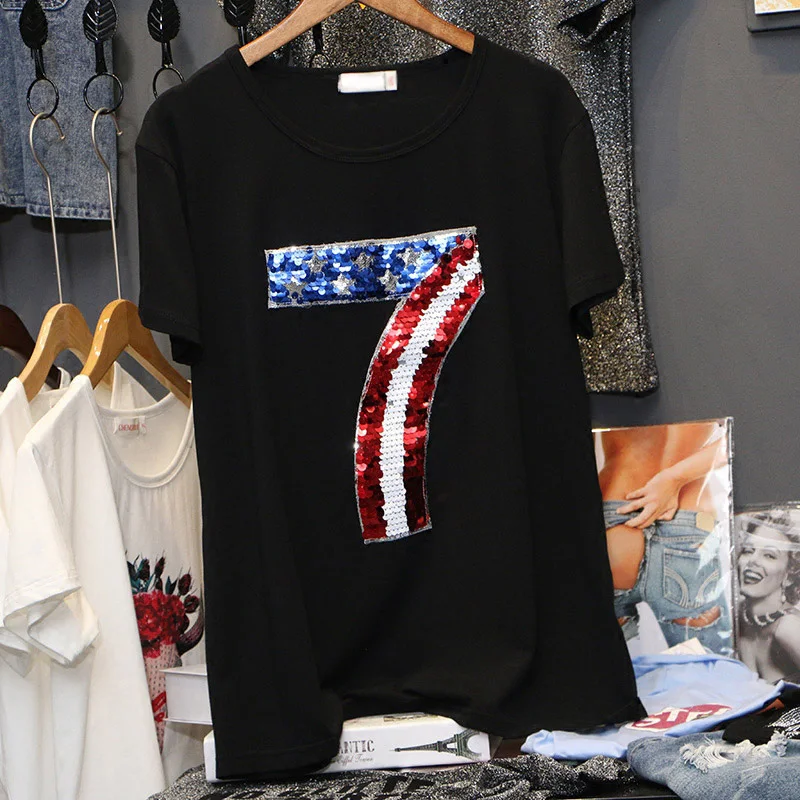 Летняя черная женская футболка с короткими рукавами и пайетками с цифрами, новая женская футболка 2021 года, модные свободные пуловеры для отдыха, универсальные пуловеры с круглым вырезом, топы