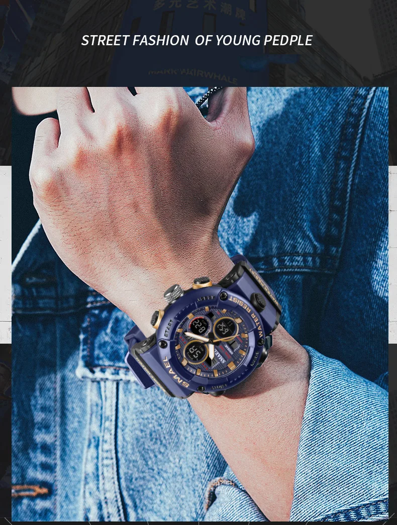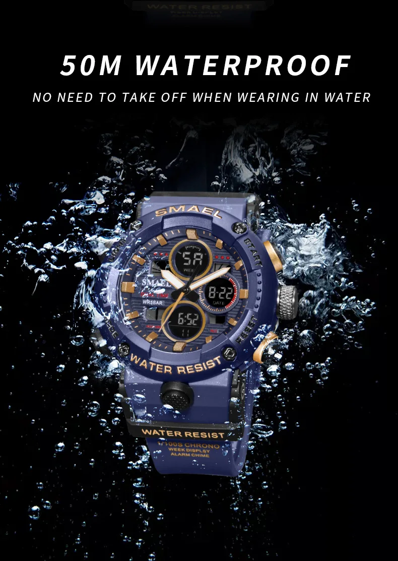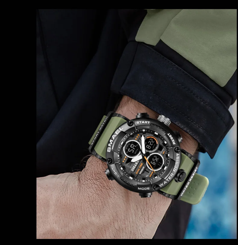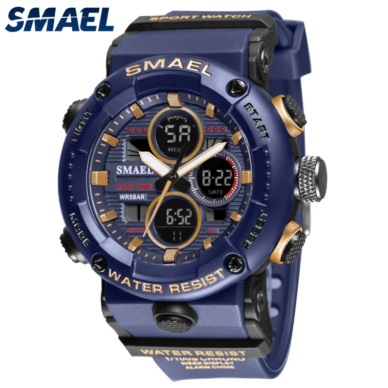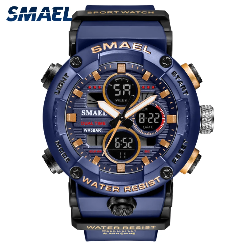 SMAEL, модные спортивные часы для мужчин, негабаритные, водонепроницаемые, 5 бар, LED Будильник, мужские цифровые часы, 2021, Современные военные наручные часы, 8038