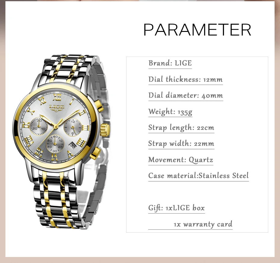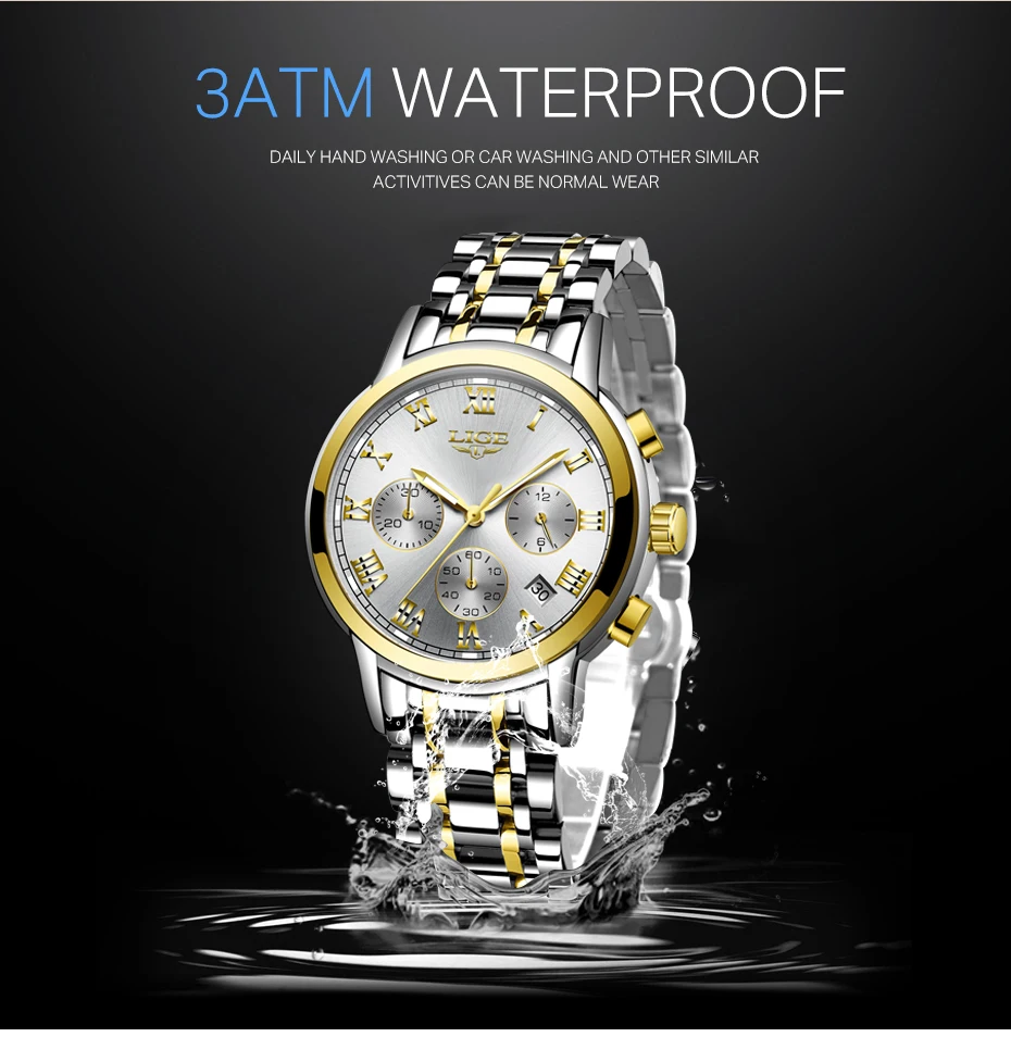 Часы наручные LIGE женские кварцевые, деловые брендовые Роскошные, розовое золото, 2021