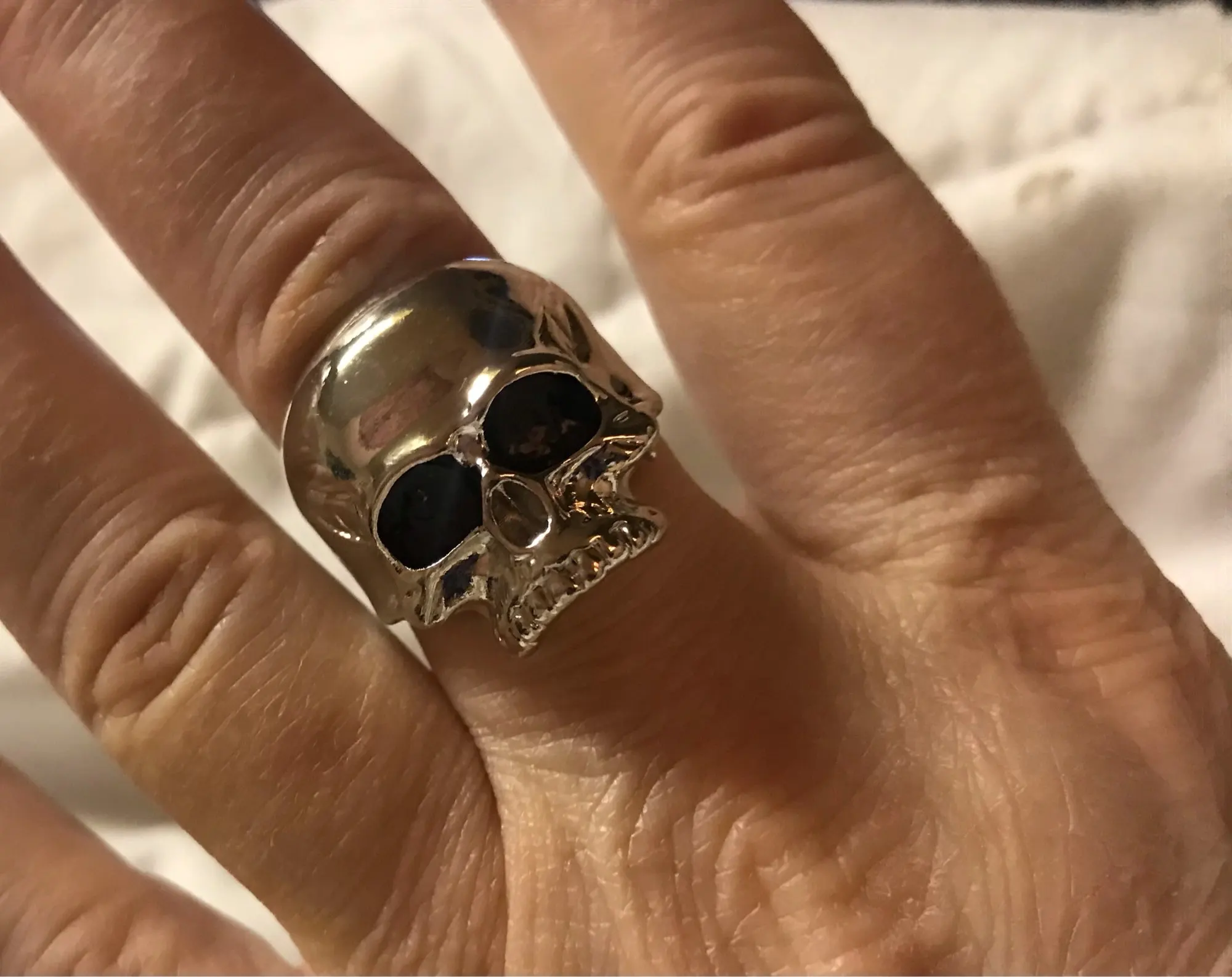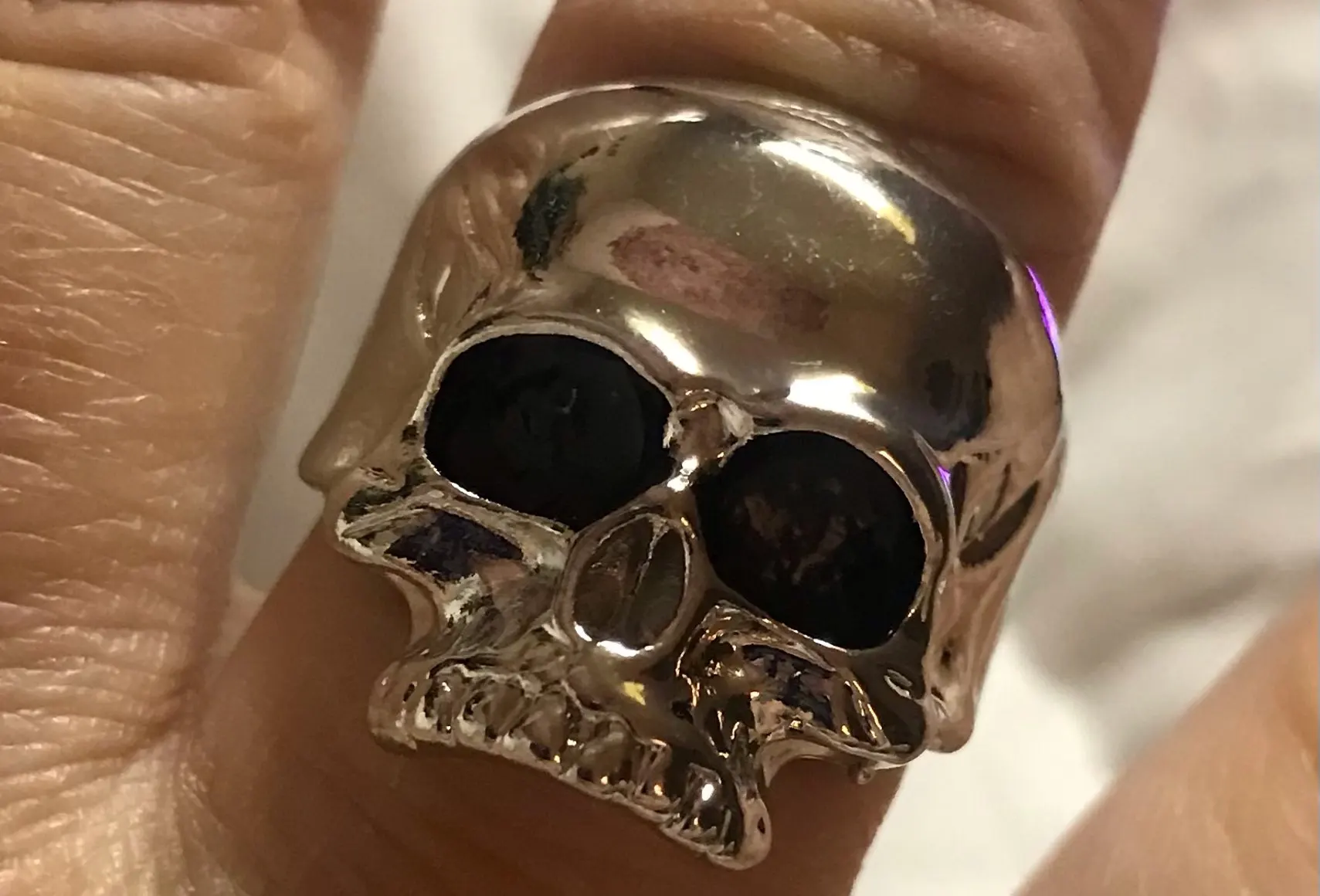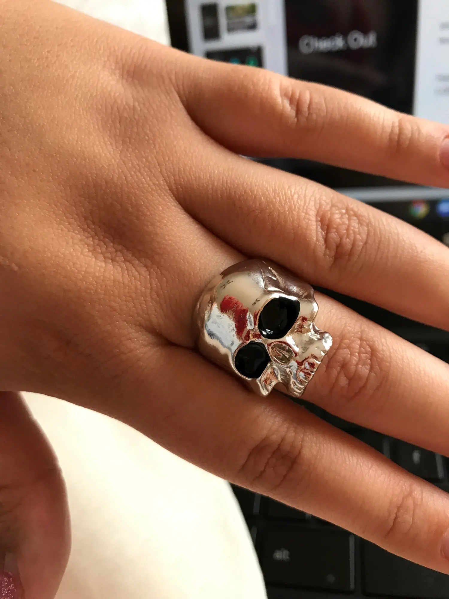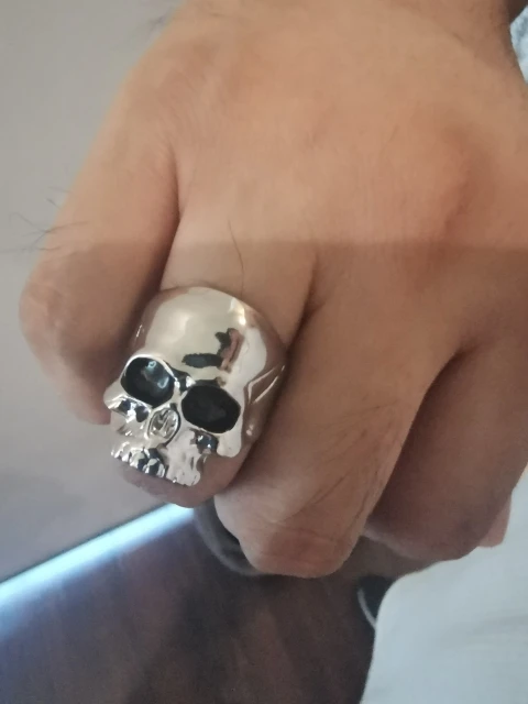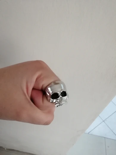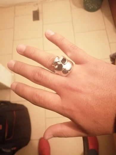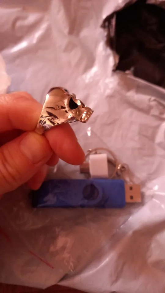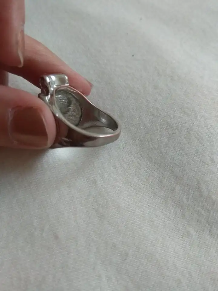 Кольцо соответствует фото. Она немного тяжелая. Она оставляет синие следы на пальцах. Тем не менее, кажется, не затягивает пальцы. Тем не менее, она красивая