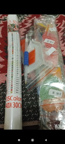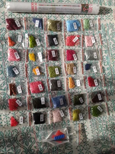 Полотно намотано на валик, запечатано в целлофан. Стразики расфасовпны по зип-пакетам. 35 цветов, цвета яркие, черного цвета мало. Конечно, для такой картины размер 30*40 маловат. Надо брать побольше. Пропечатка нормальная . Продавца рекомендую.