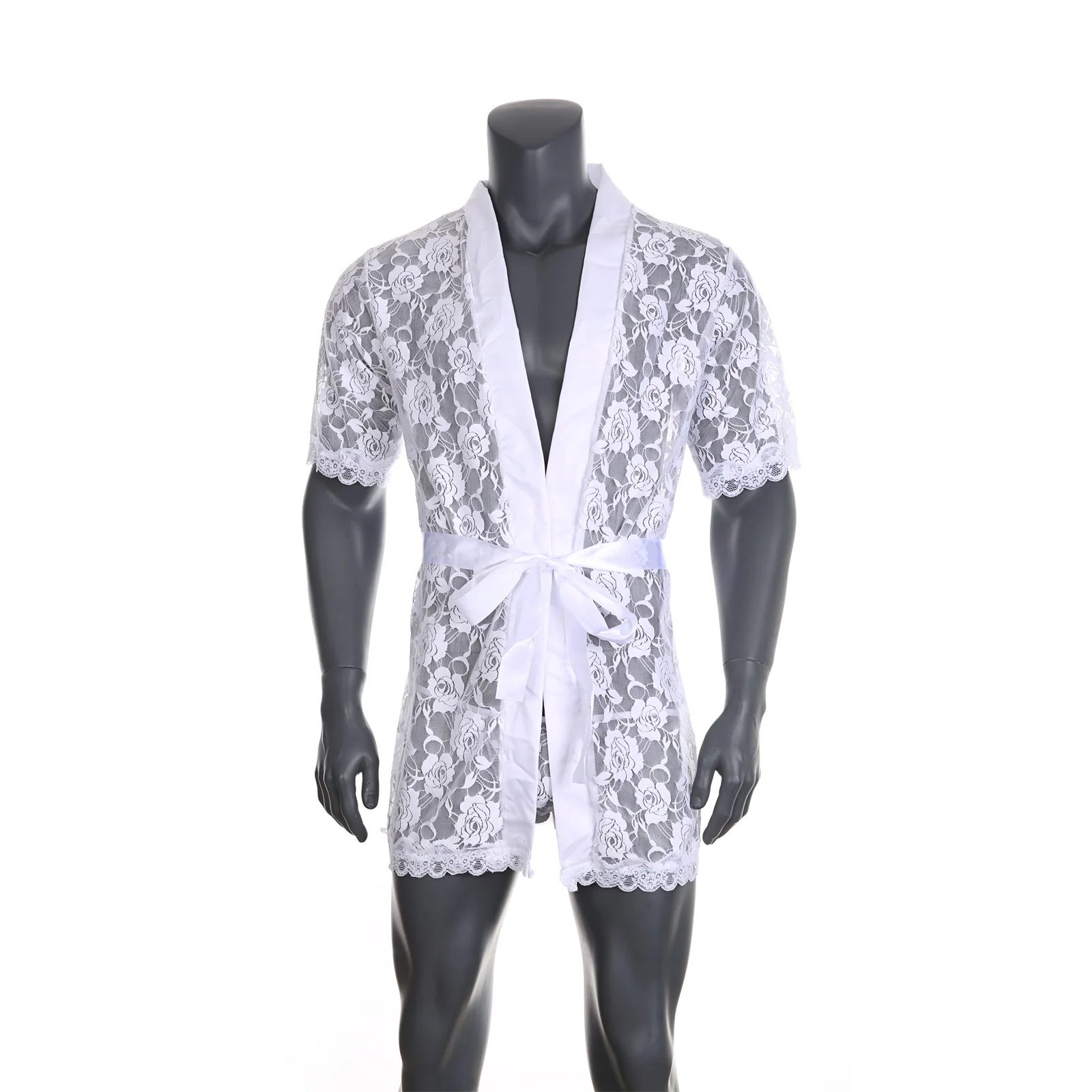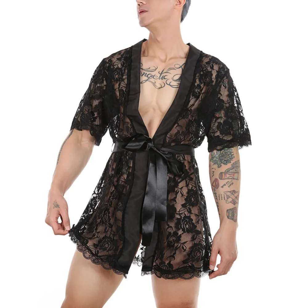 Мужской кружевной халат-кимоно, ночная рубашка с длинным халат пикантная Пижама, Мужская свободная банная рубашка, домашняя одежда, эротический костюм с Т-образной спиной
