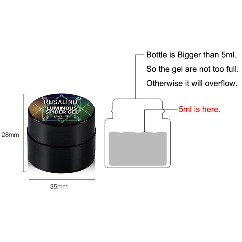 1. Объем составляет 5 мл. Поскольку емкость бутылки составляет более 5 мл, гель для ногтей не будет полностью заполнен бутылкой!