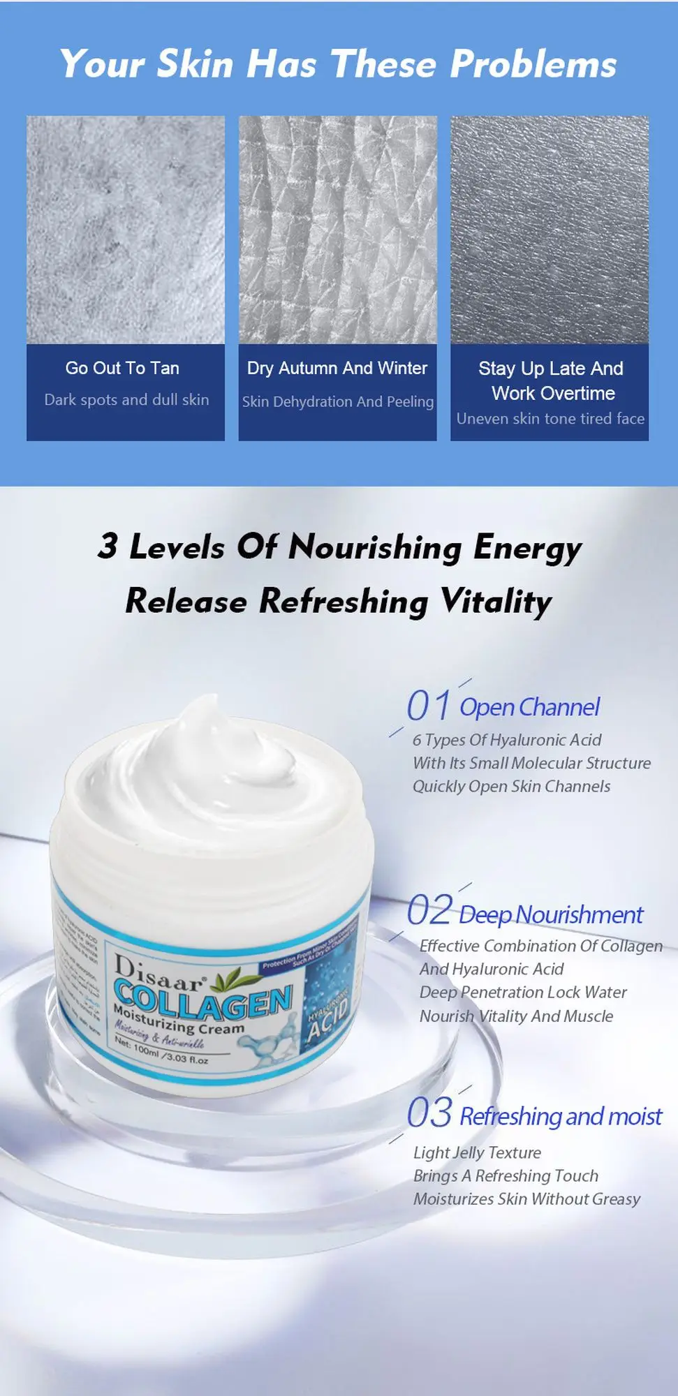 01 OpenChannel6 типов гиалуроновой кислотыС небольшой молекулярной структуройБыстро открывайте каналы кожи02 глубокое питаниеЭффективное сочетание коллагенаИ гиалуроновой кислотыГлубокая Блокировка водыПитает жизненную силу и мышцы03 переплетение и увлажнениеСветильник с желейной текстуройПриносит освежающий штрихУвлажняет кожу без жирности
