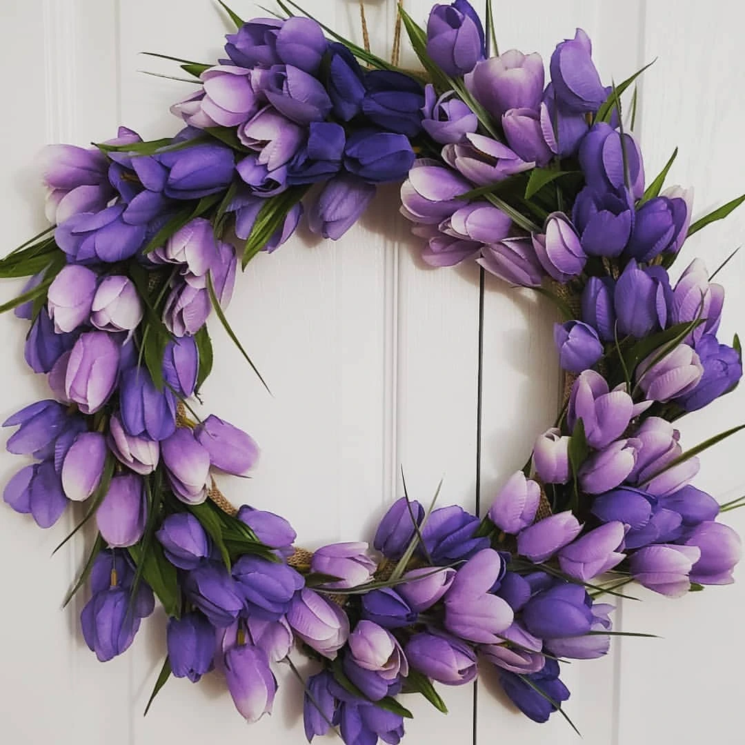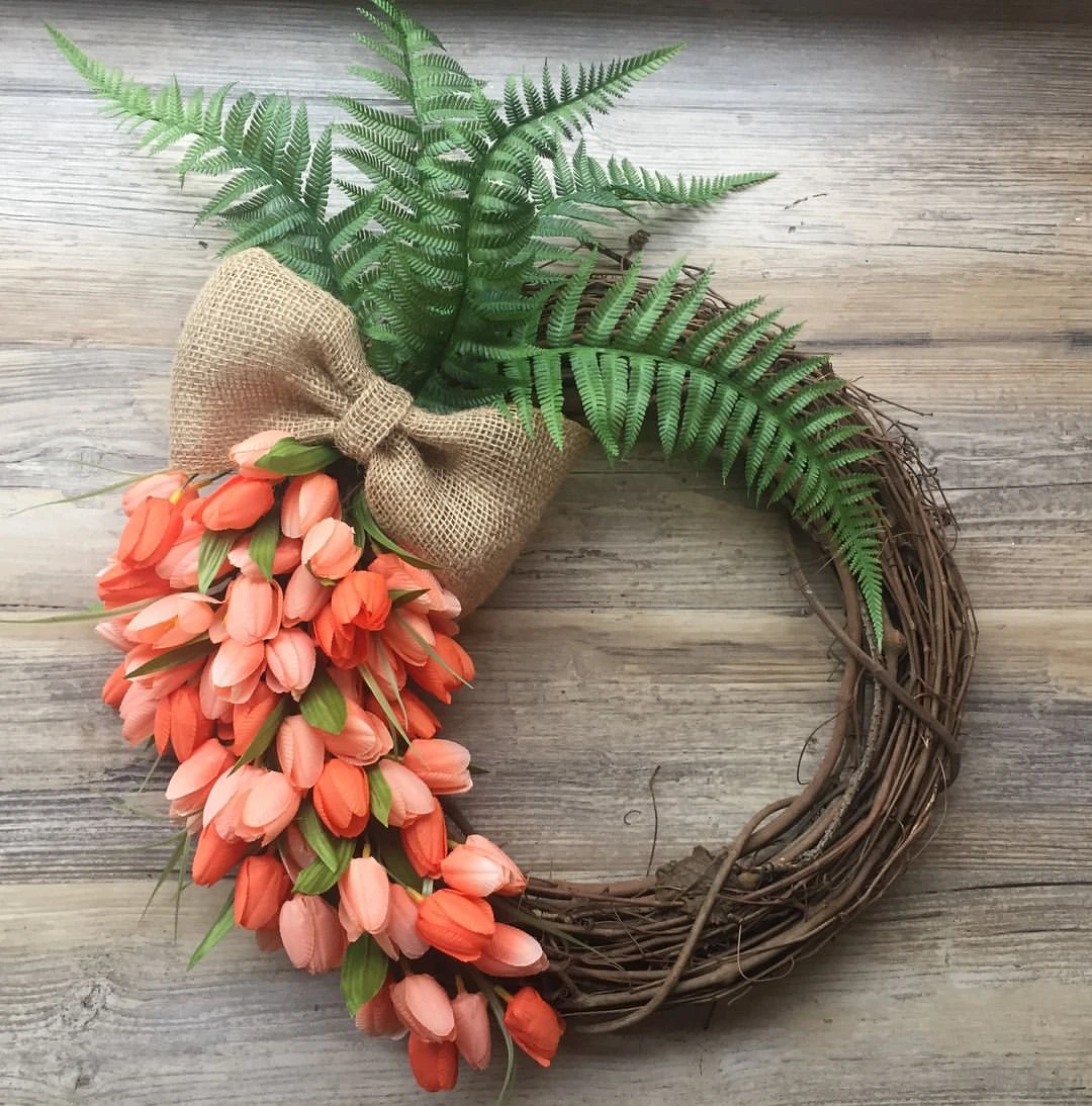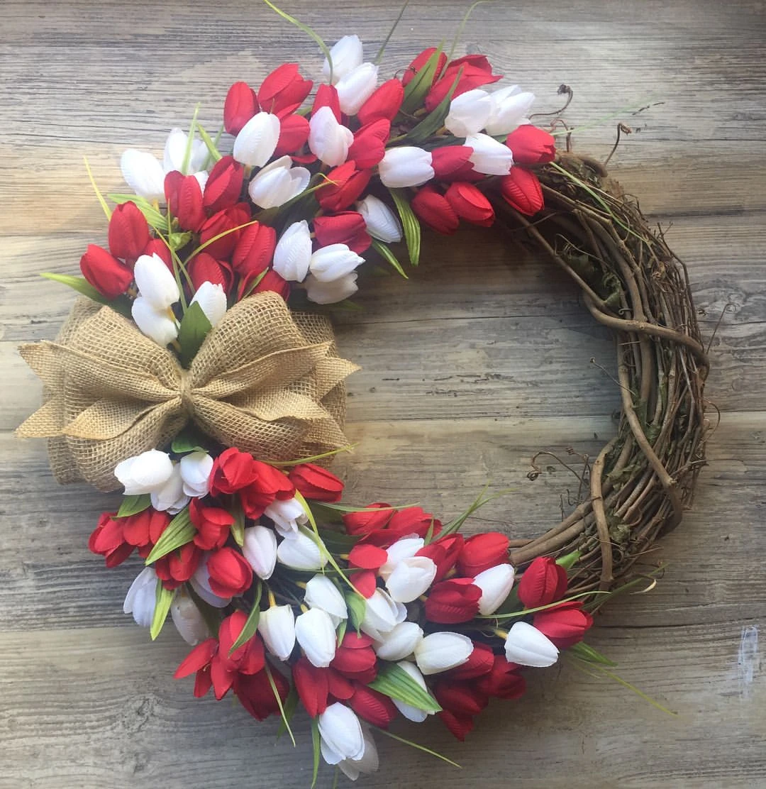 Делала венок из ротангового обруча, 30см в диаметре и 50 Тюльпанов. Проволки хватило на все цветы