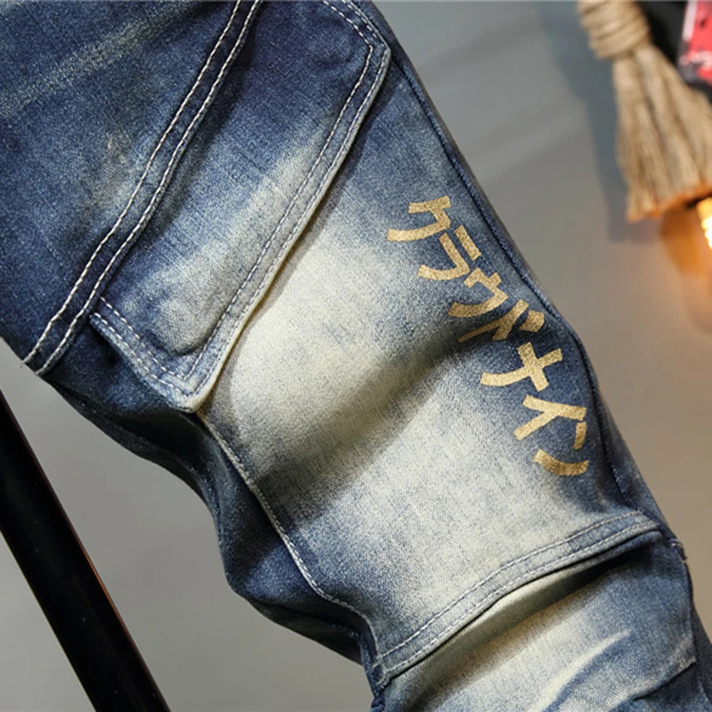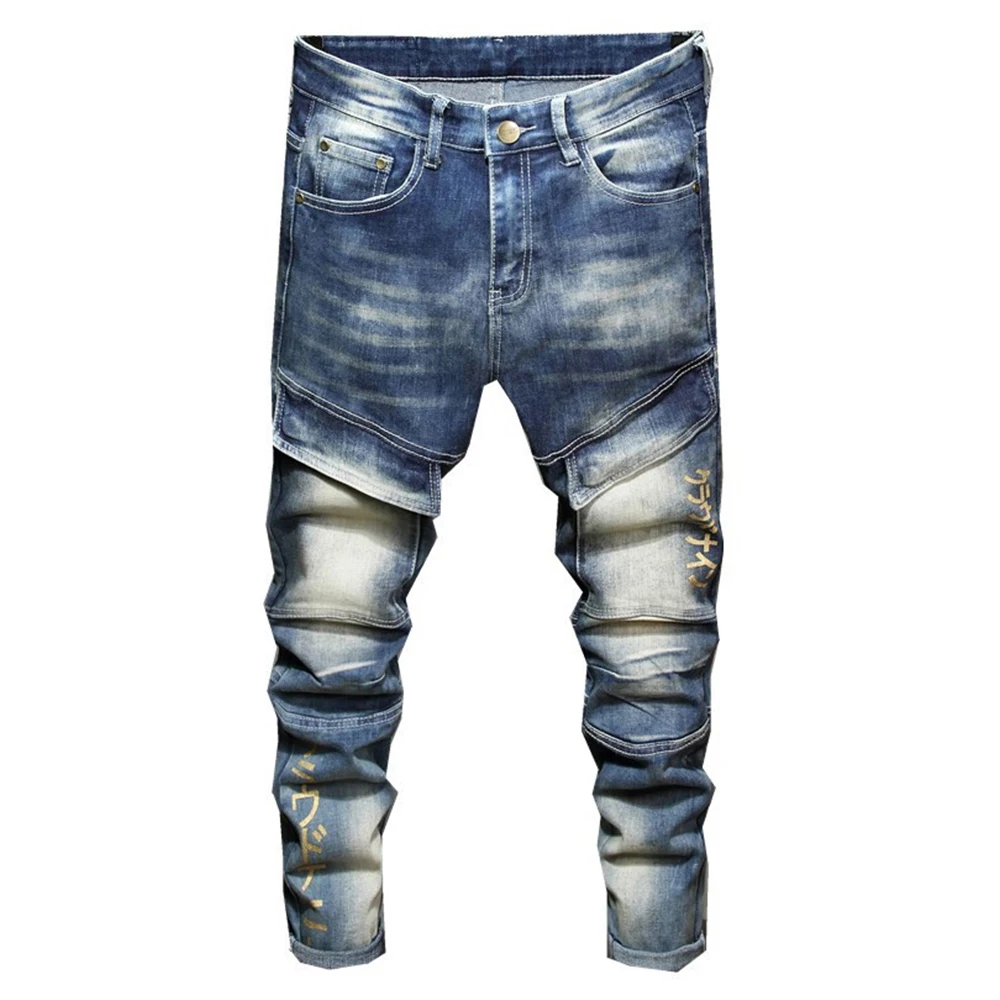 Мужские джинсы-карандаш, с несколькими карманами, зауженные джинсы из денима, с принтом японских букв
