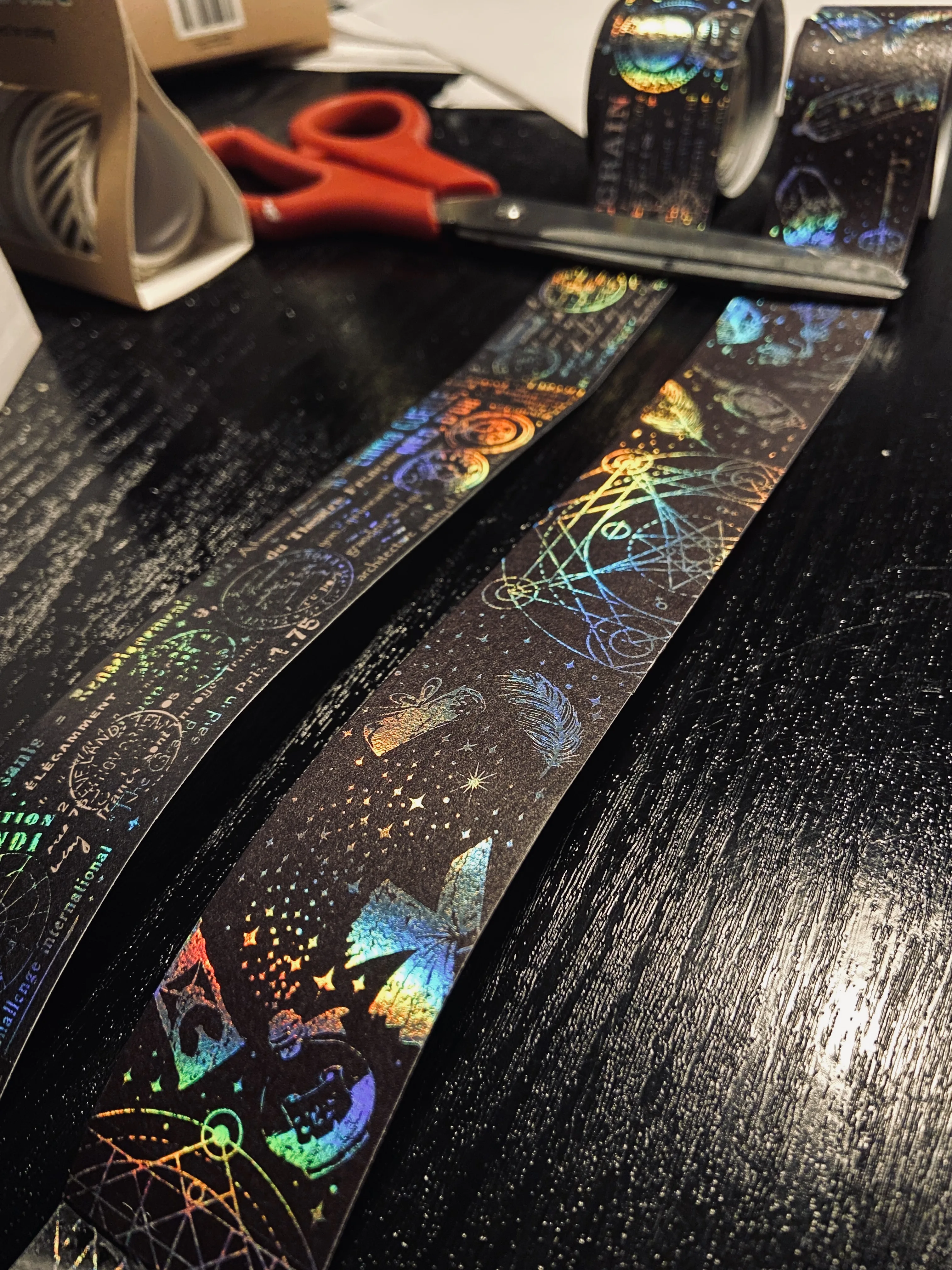 Оч крутой скотч, хотя больше подойдёт название самоклеящейся ленты, ибо можно развернуть полностью, отрезать нужный фрагмент или кусок, отклеить подложку и уже тогда прикдеить, как по мне оч удобная вещь, и вид самой ленты волшебный, очень красиво переливается) все пришло оч быстро