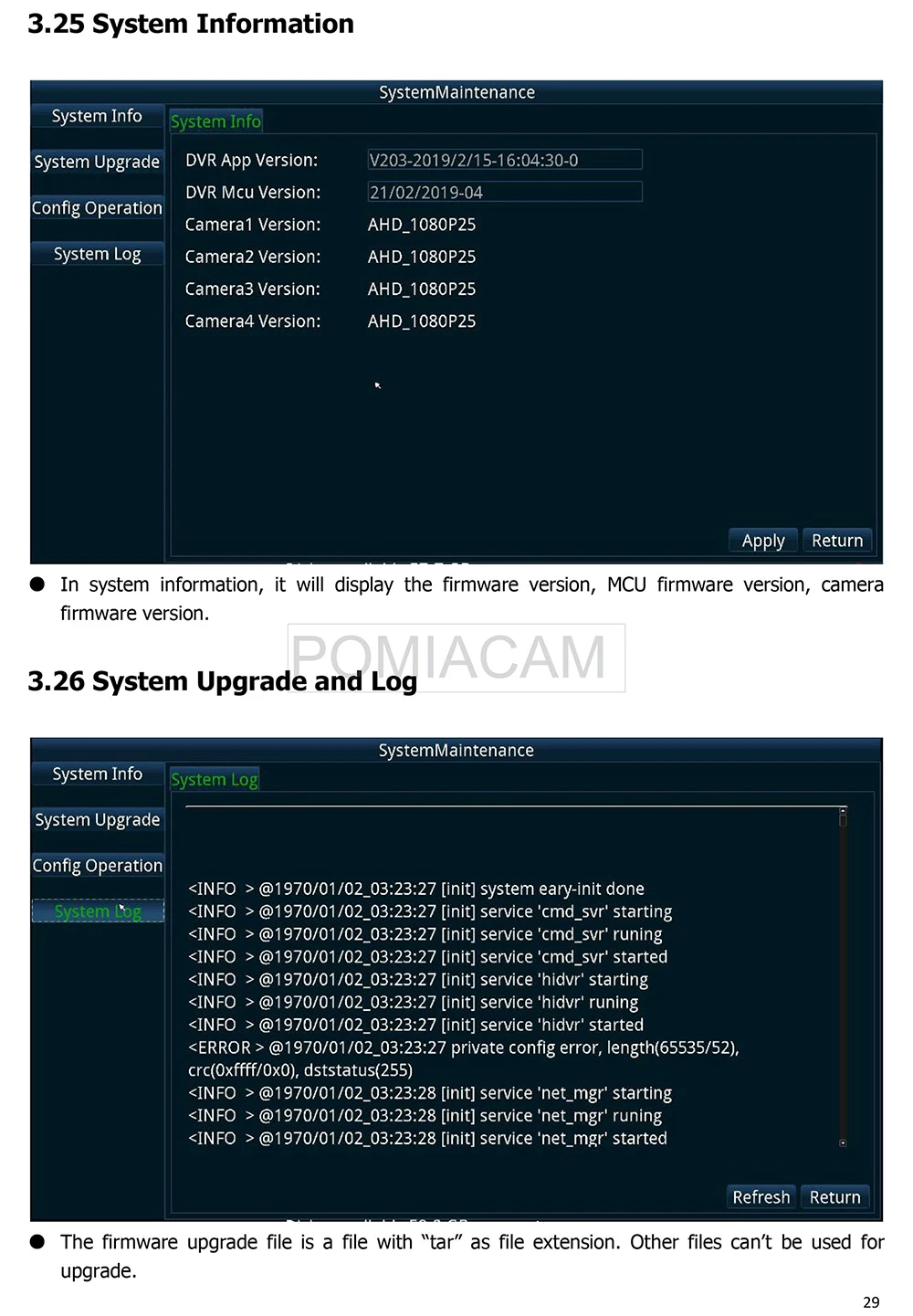 Модель: SDVR004PRO Системы Операционная система: Linux 3,0 Время загрузки: менее 30 секунд (включение видео) Системные языки: английский/китайский Рабочий интерфейс: графический рабочий интерфейс Видео 1. Видеовход: 2. Поддержка четырехканальной записи HD-камеры 1080P AHD (посылка комплект не входит камера) 3. Поддержка четырехканального 1080P AHDP AHD HD (посылка комплект не входит камера) 4. Видеовыход: 2 видеовыхода (1 выход HDMI, 1 выход CVBS) 5. Разрешение видео: Дополнительно 1960*1080, 1280x720, 960x540 (в соответствии с моделью камеры) 6. Режим записи: Загрузочная запись, синхронизация, будильник 7. Частота кадров: 120fps @ 1080P 8. Предварительный просмотр видео: поддержка одного изображения/двух изображений/четырех изображений 9. Стандарт сжатия видео: H.265 /h.264 Аудио Аудиовход: Четыре аудиовхода (если кабель интерфейса авиационной головки, для камеры требуется встроенный звукосниматель, камера в комплект не входит) Сжатие звука: формат PMC (в зависимости от звукоснимателя, не входит в комплект) Метод записи: Поддержка одновременной записи звука и видео Обработка и хранение изображений Локальная запись: поддержка разрешения 1960*1080, 1280x72 0/960x540 Скорость передачи видео: каждая камера поддерживает 100 ~ 8000 Кбит/с Хранение данных: максимальная поддержка 1 SD-карты 256 ГБ Вызовите полицию Вход сигнала тревоги: 3 сигнала тревоги, 1 вход скорости, 1 сигнал зажигания, 1G-сенсор, поддержка 1 кнопки аварийной ситуации (посылка вая модель не включает аварийную кнопку, модуль GPS, при необходимости, пожалуйста, выберите модель GPS) Выход тревоги: 1 зуммер, Выходная линия тревоги, Дисплей тревоги и т. д. Тревожный триггер: тревога потери видео, тревога превышения скорости, сигнализация о столкновении, тревога места для хранения, обнаружение движения, сигнализация дистанционного управления Интерфейс связи Интерфейс RS232: 1 Интерфейс RS232 Сетевой интерфейс RJ45: 1 сетевой интерфейс RJ45 100M USB 1 USB, обновление системы используется для, внешняя мышь и другие операции Глобальная система позиционирования (GPS) Международная стандартная Глобальная система позиционирования (GPS): (базовая версия не включает модуль GPS, если вам нужна эта функция, выберите модель с модулем GPS) Поддержка GPS/ГЛОНАСС, запись географических координат в реальном времени, данных о скорости и беспроводной загрузки,