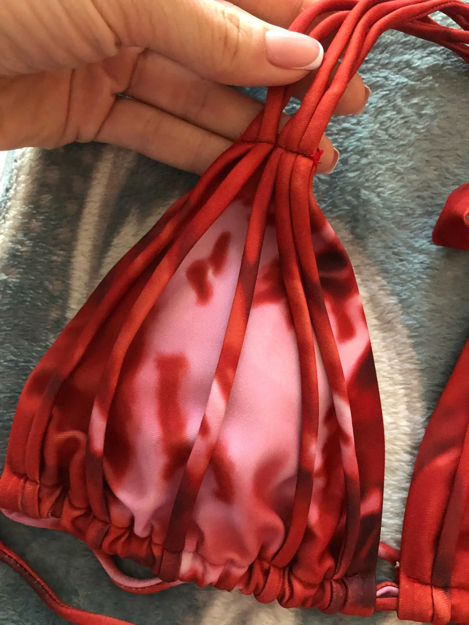 Размер M заказанный, бикини с лямкой на шее, топик падает как xs, а трусики бикини больше как L