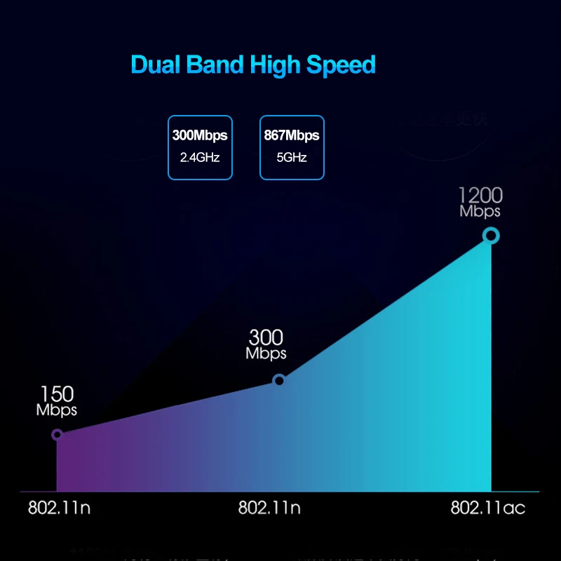* AC1200 принимает стандарт беспроводной передачи 802.11AC, скорость передачи может достигать 1200 Мбит/с (2,4G 300 Мбит/с + 5,8G 867 Мбит/с)