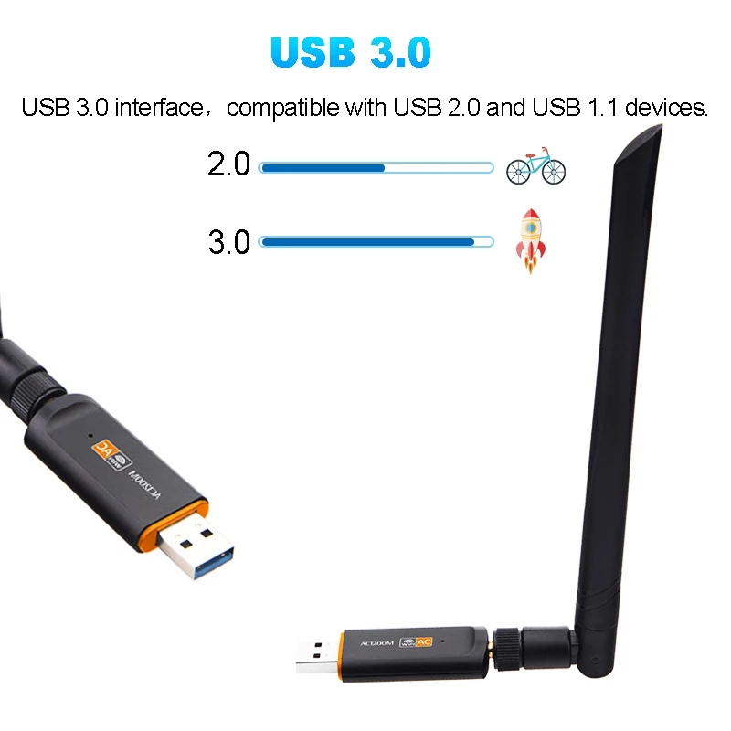* AC1200 использует интерфейс USB3.0 для обеспечения более быстрой и эффективной передачи данных. Ставка достигла в 2 раза больше, чем у основных сетевых карт интерфейса USB2.0 на рынке, и она обратно совместима с устройствами USB2.0 и USB1.1