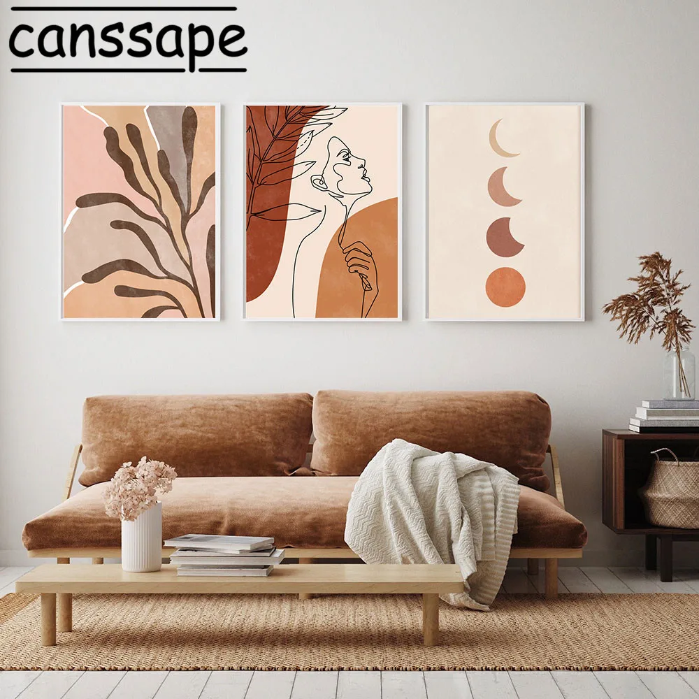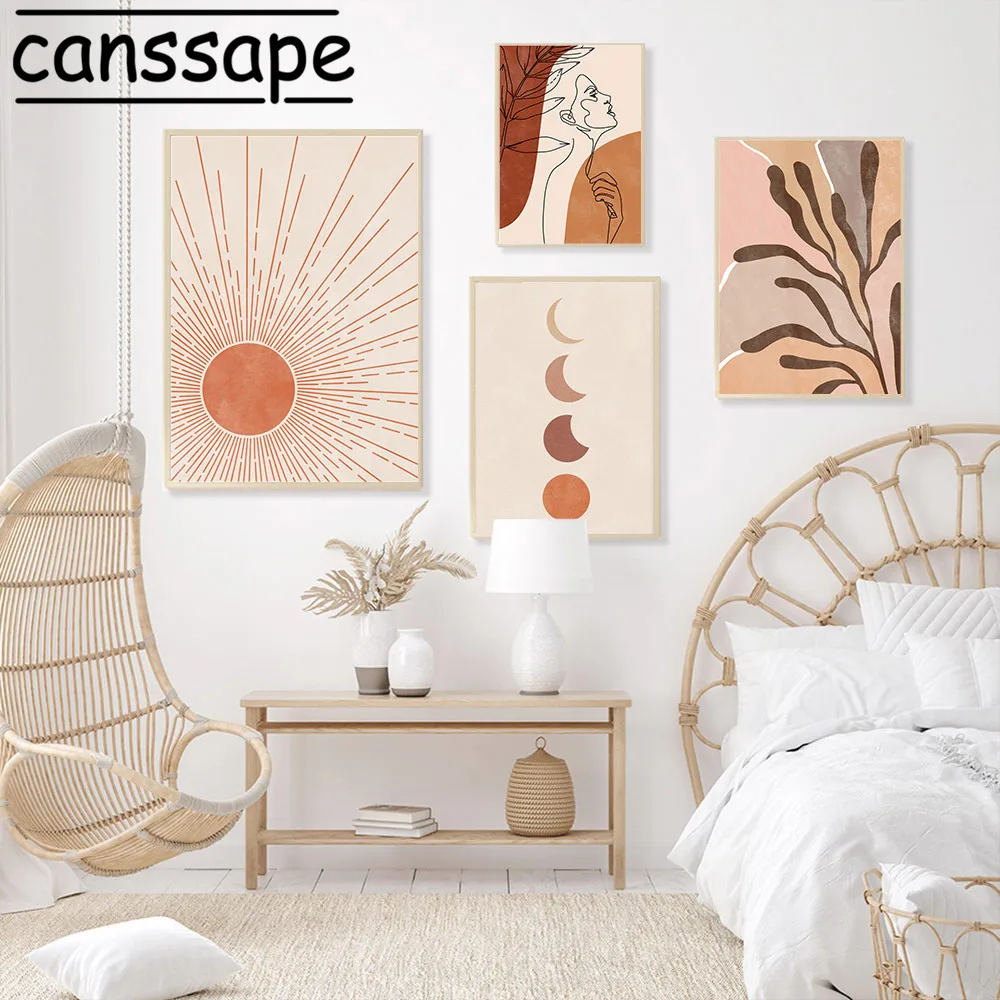 Настенный постер с изображением девушек и листьев, бежевый холст, принты солнца среднего века, Луны, абстрактная живопись, современные настенные картины, украшение для спальни