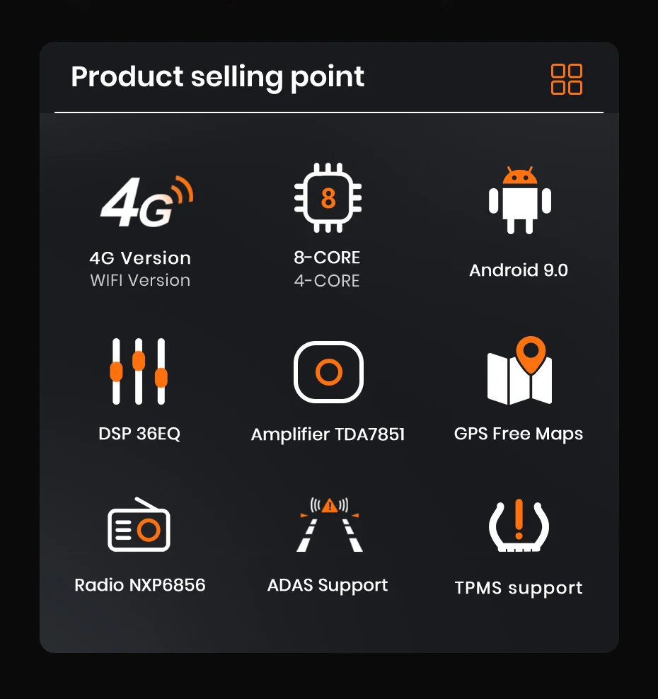 > 9 дюймов 2.5D емкостный Экран + 4 ядра 1,2 ГГц Процессор + DDR3 1 ГБ/2 ГБ/4 ГБ флэш-памяти (опционально) + 16 Гб/32 ГБ/64 Гб памяти (опционально) + встроенный Wifi (4G сеть опционально) + gps-навигация (Бесплатное обновление карты) + управление рулевым колесом + зеркальная связь + Bluetooth + Встроенный микрофон + FM/AM + RDS + Поддержка USB DVR ADAS + Поддержка Европейской DAB функции + 1080P видео воспроизведение + HD 1024*600 + Поддержка контроля давления в шинах Системы> OSD языкРусский, английский, испанский, итальянский, французский, немецкий, китайский, эстонский, польский, филиппинский, финский, корейский, голландский, хорватский, латышский, литовский, румынский, норвежский, португальский, японский, шведский, тайский, турецкий, украинский, венгерский. > 7*24 часов обслуживанияВ Awesafe наша миссия упорно работает, чтобы предоставить вам надежный и замечательный Автомобильный мультимедийный плеер/автомобильное радио, инновационное оборудование и программное обеспечение, а также бесплатные обновления для прошивки, программного обеспечения, GPS навигационные карты.