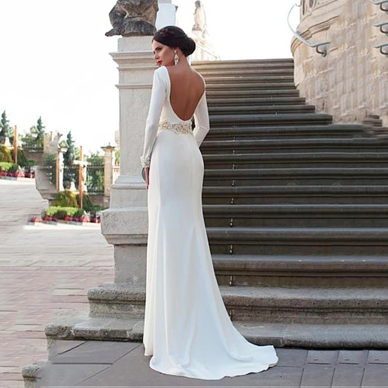Образец сатина Бохо свадебное платье 2020 с длинными рукавами свадебное платье с цветочным поясом с глубоким вырезом Свадебные платья без спинки