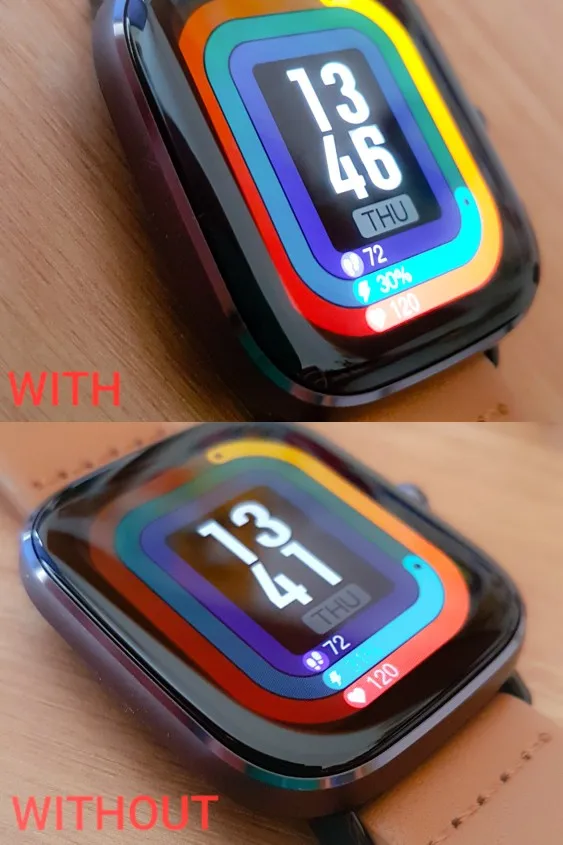 Установка без пузырьков и без удаления липких остатков. Простые инструкции позволяют быстро и без проблем установить. Внутри клейкий клей может сделать защитную пленку для экрана хорошо прилегающей к часам, а черная часть может предотвратить попадание воздуха и пыли в зазор между защитной пленкой и умными часами.