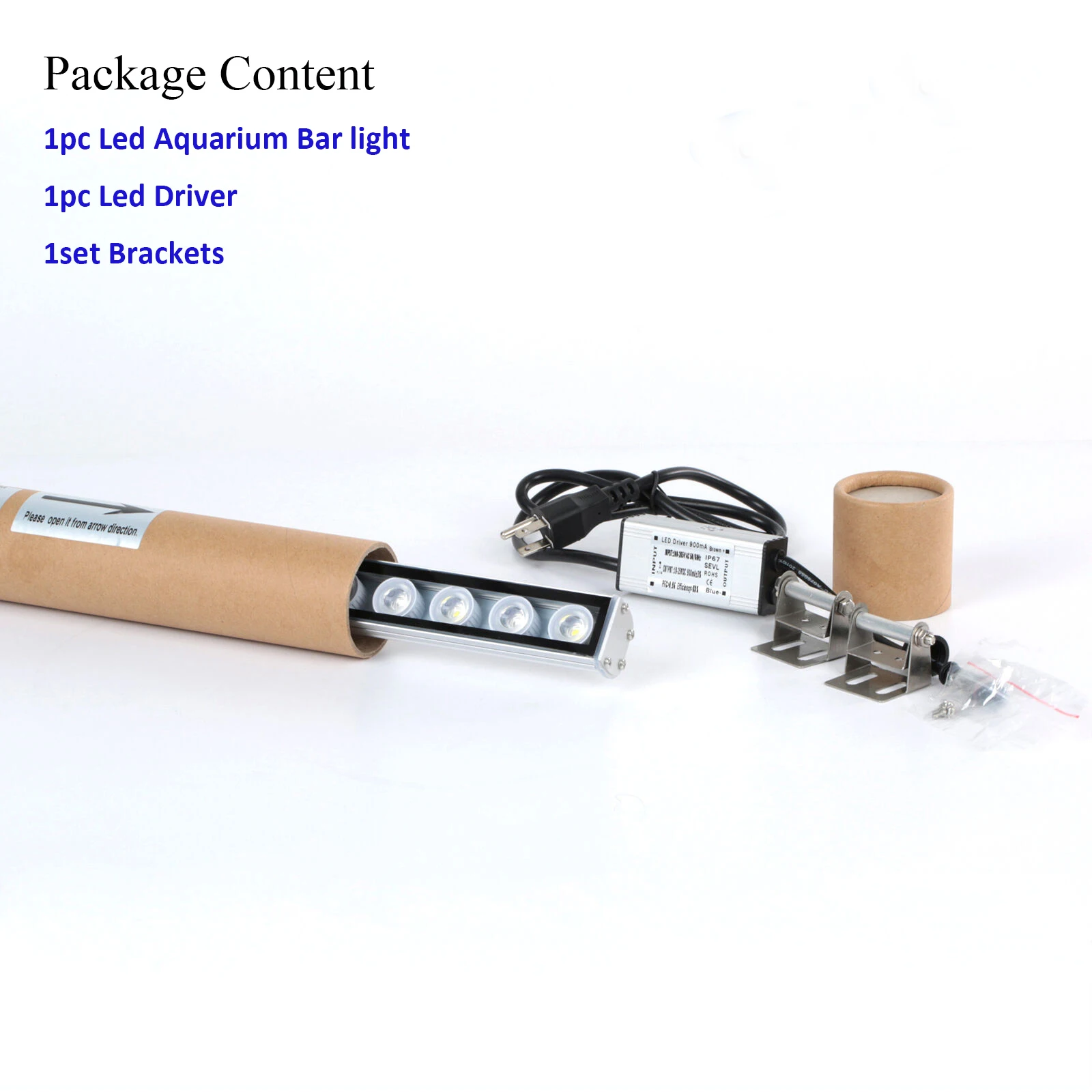 Посылка включает в себя:1 xСветодиодная аквариумная панельСветильник1 x источник питания2 xРегулируемые кронштейныРуководство по эксплуатации: