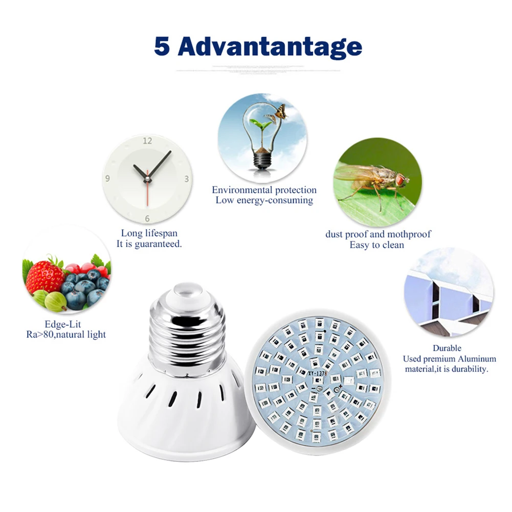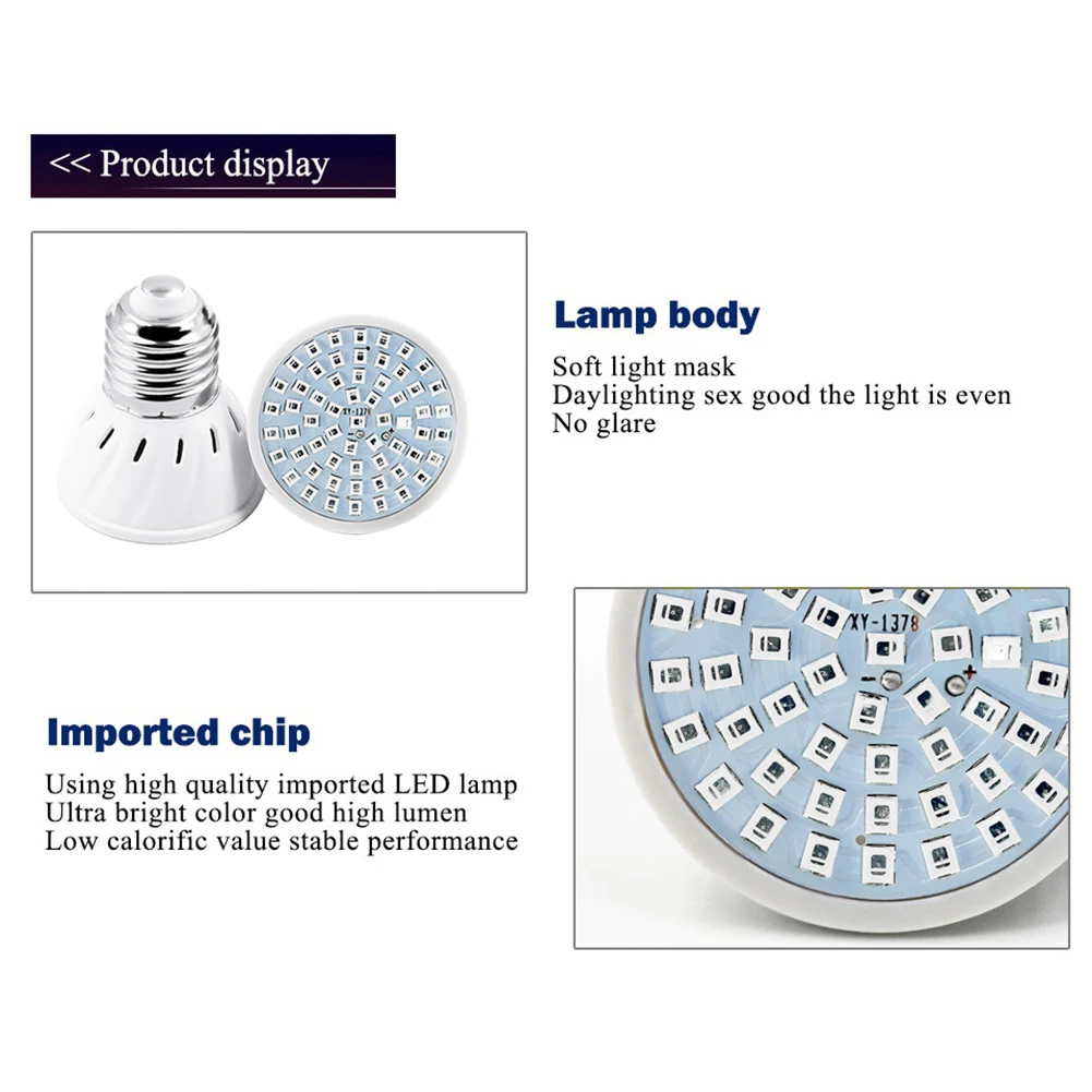 Растущие лампы полный спектр E27 220V светодиодный комнатный садовый растительный светильник для роста цветов Лампа для роста для помещений Характеристики: Энергосбережение, высокая эффективность и долговечность. Светодиодный спектр, необходимый и критичный для выращивания и цветения растений. Идеально подходит для небольших коробок для выращивания, палаток для выращивания, Гидропоники DIY, бонсай, сада и т. д. Тип: светодиодный светильник для выращивания растений Материал: пластик + электронный компонент Напряжение: 220 В Тип цоколя: E27 Количество СВЕТОДИОДНЫЙ: 60 шт. Характеристики: полный спектр, садовый инструмент, прочный Высота: 5,5 см/2,17 "(прибл.) Диаметр: 5 см/1,97 "(прибл.) Примечания: Благодаря светильник и экрана Цвет Товара может быть s светильник ly отличается из-за характеристик монитора компьютера. Возможны незначительные отклонения в размерах из-за различных измерений вручную. Посылка включает в себя: 1 х светодиодный светильник для выращивания
