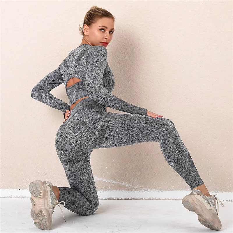 Бесшовный комплект, женская одежда для спортзала и фитнеса, спортивная одежда, женские леггинсы с высокой талией и Топ с длинным рукавом, спортивный костюм