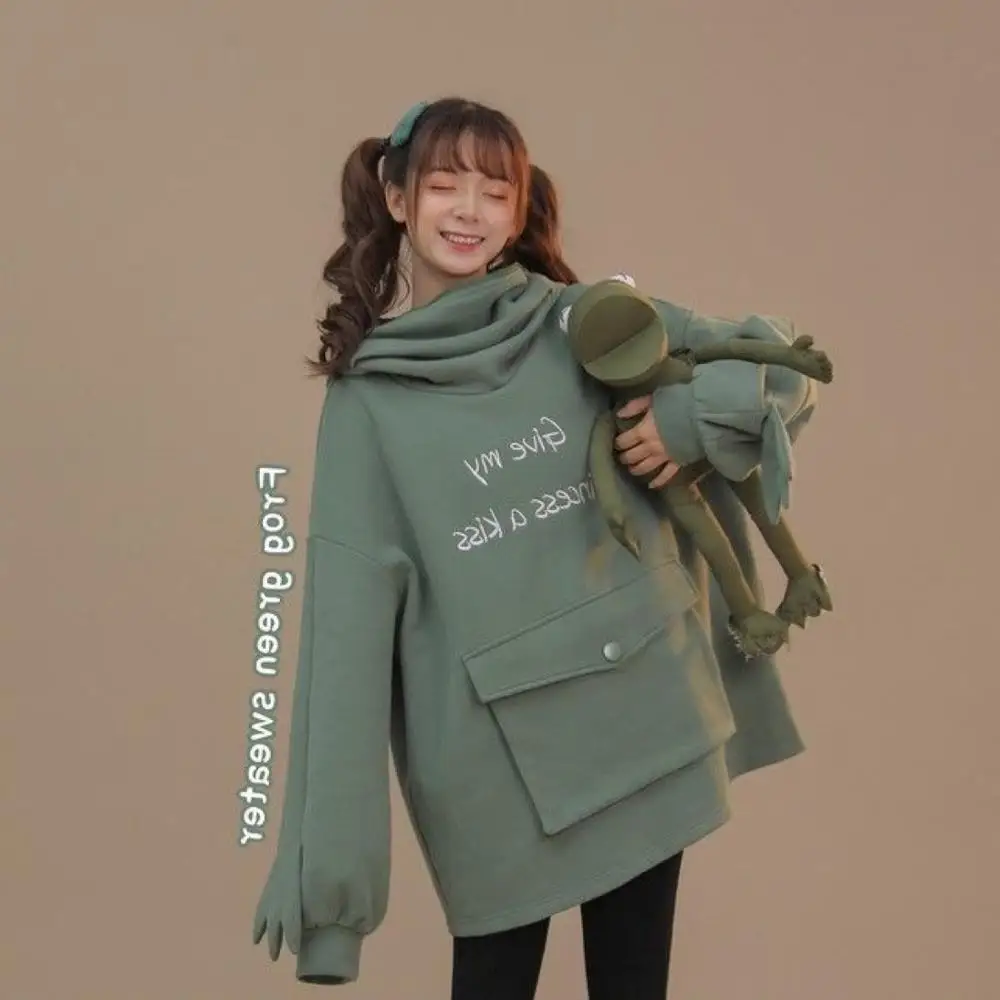 Женские осенние толстые Свободные Толстовка Y2k Kawaii с симпатичным печатным рисунком лягушки повседневные Толстовки с капюшоном свитер для девочек; Утепленное пальто куртка-ветровка