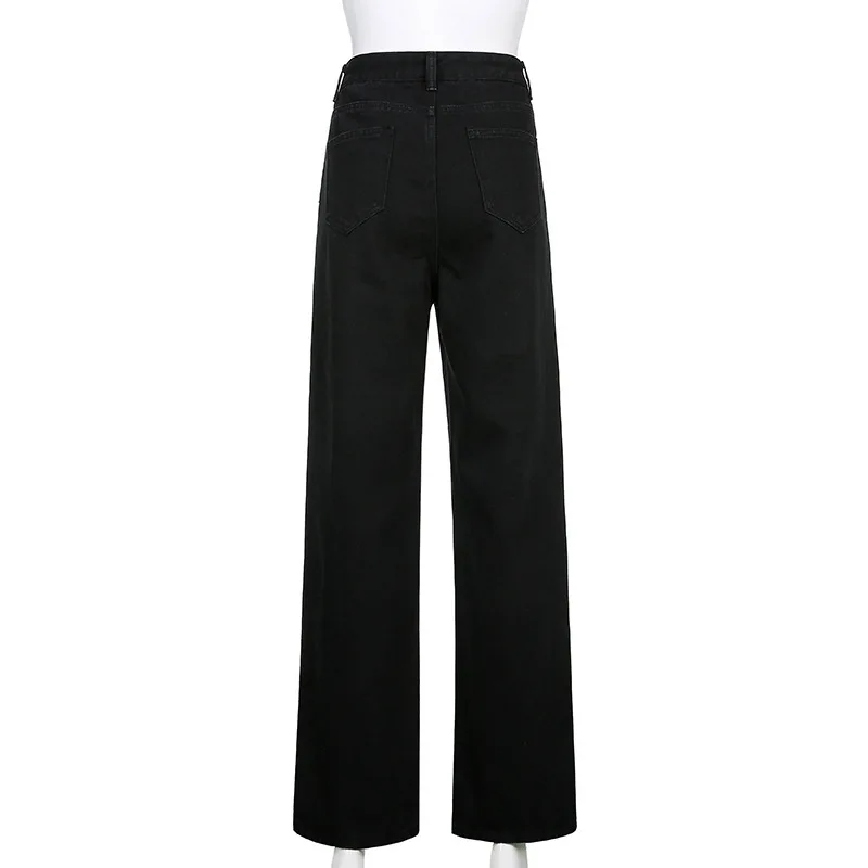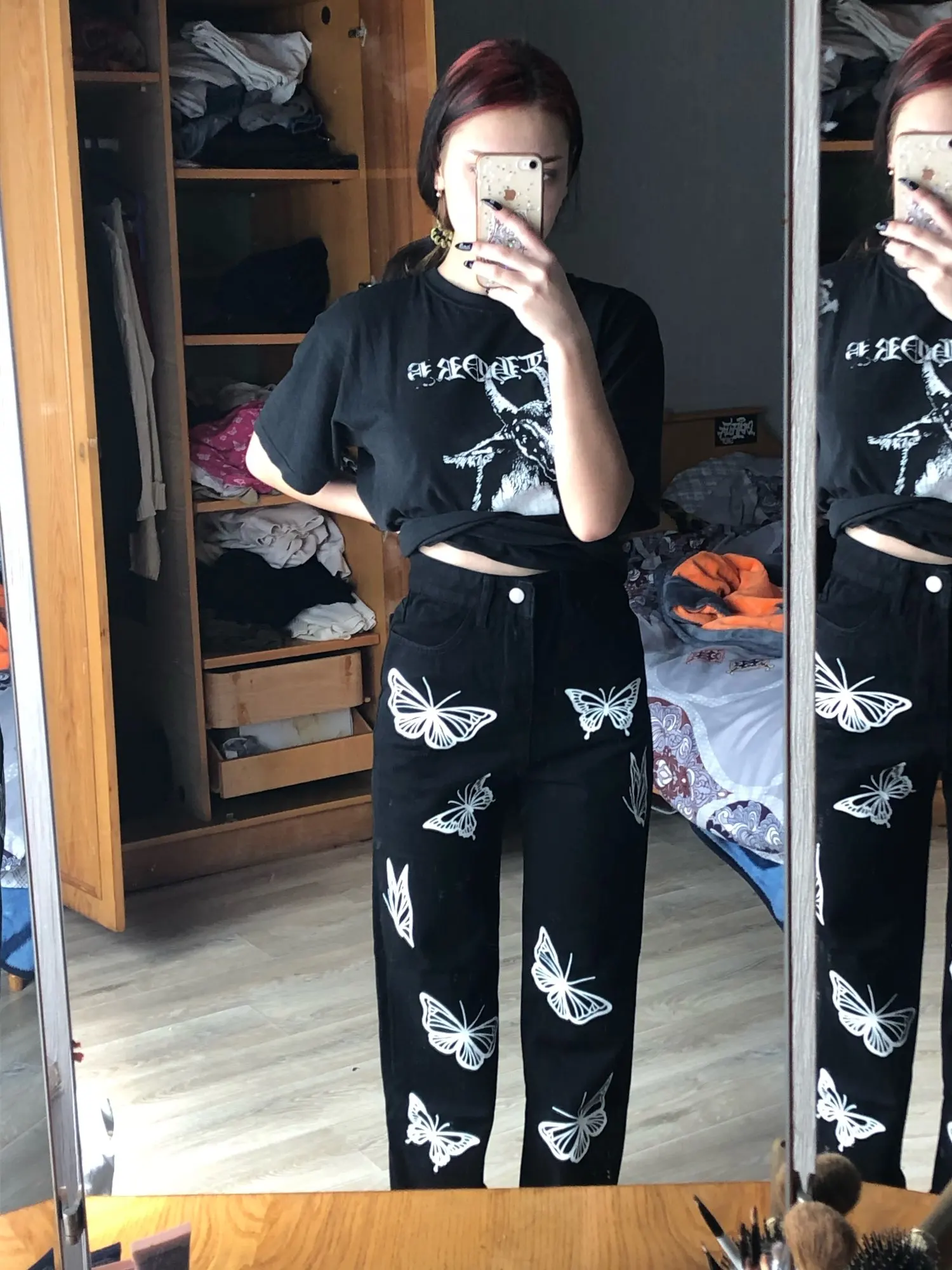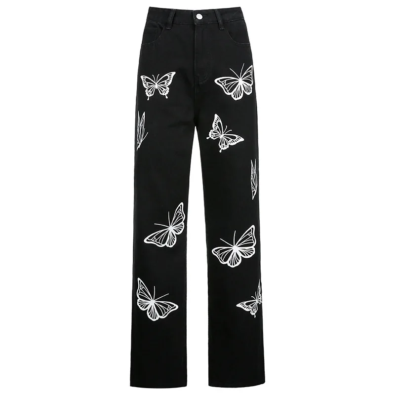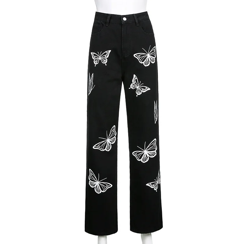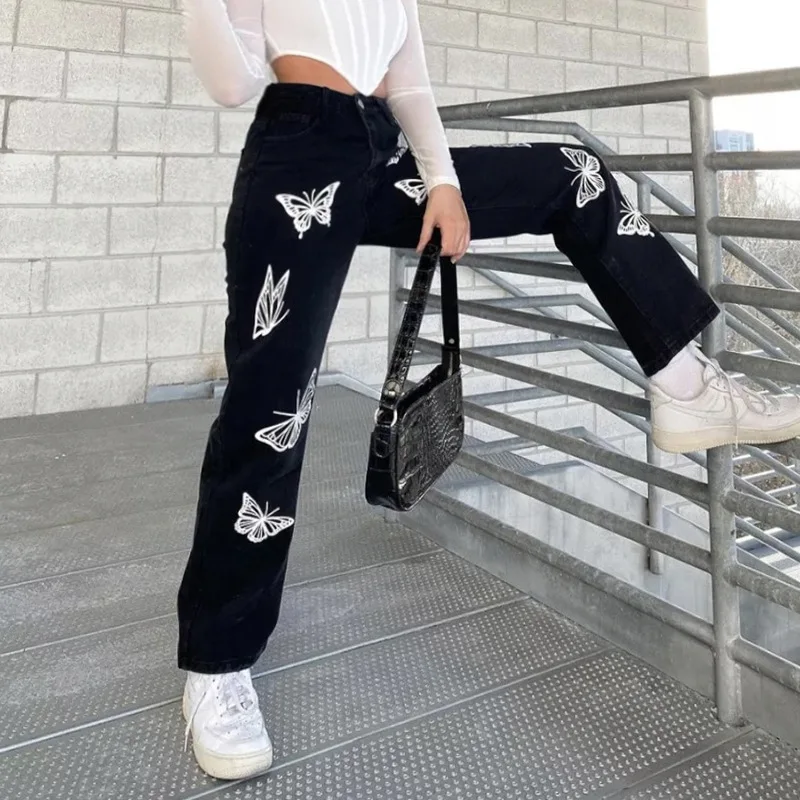 Черные мешковатые джинсы, женские брюки из денима с принтом бабочки, модные прямые длинные брюки с высокой талией, женская уличная одежда 2021