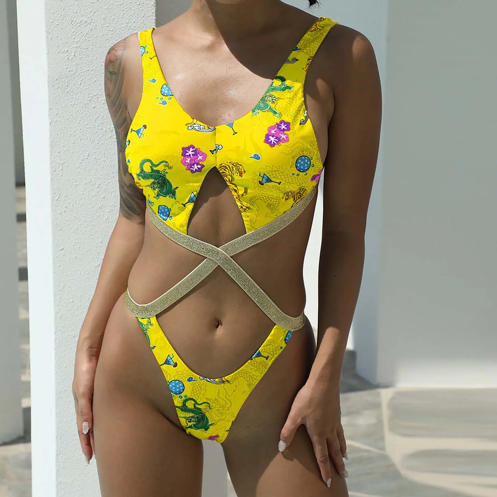 Женский слитный купальник с принтом китайского дракона, открытый бразильский купальник с вырезами, купальники # p4, на лето