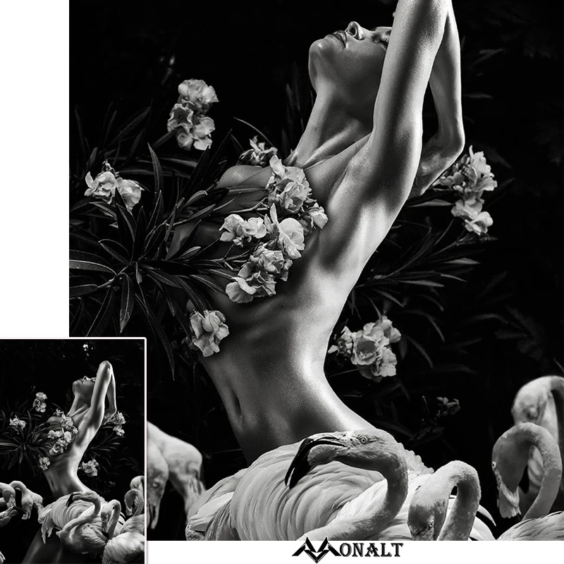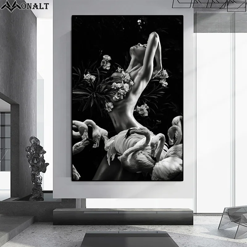 Картина на холсте, настенное искусство, цветок, женщина, фламинго, черно-белый плакат и принты, украшение комнаты в скандинавском стиле, картина маслом с животными