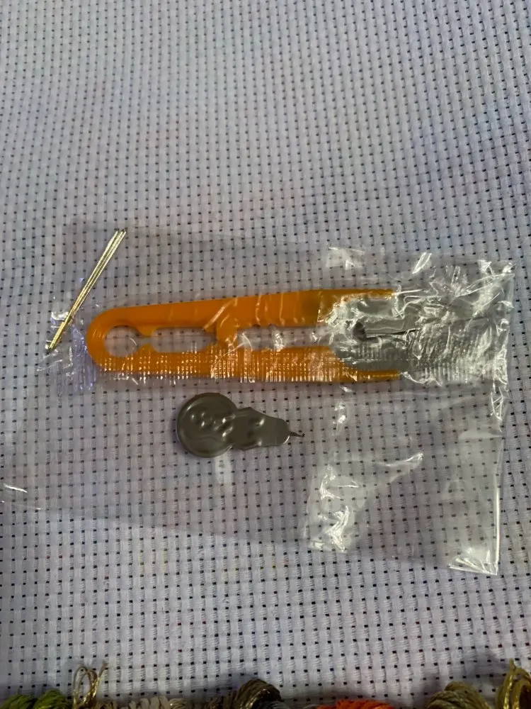 набор летел долго. нитки, ножницы, иголки, схема и принтированная канва. нет картинки, что должно получиться - очень жаль. хотелось бы видеть, что вышиваешь!
