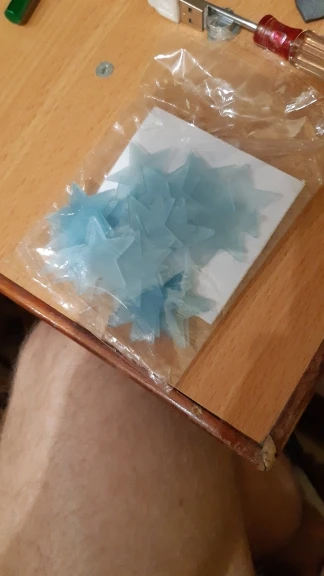 Звезды не светятся в темноте, зря только клеила на потолок. Размер маленький, примерно как 5 рублей монета. Доставка 2 месяца.